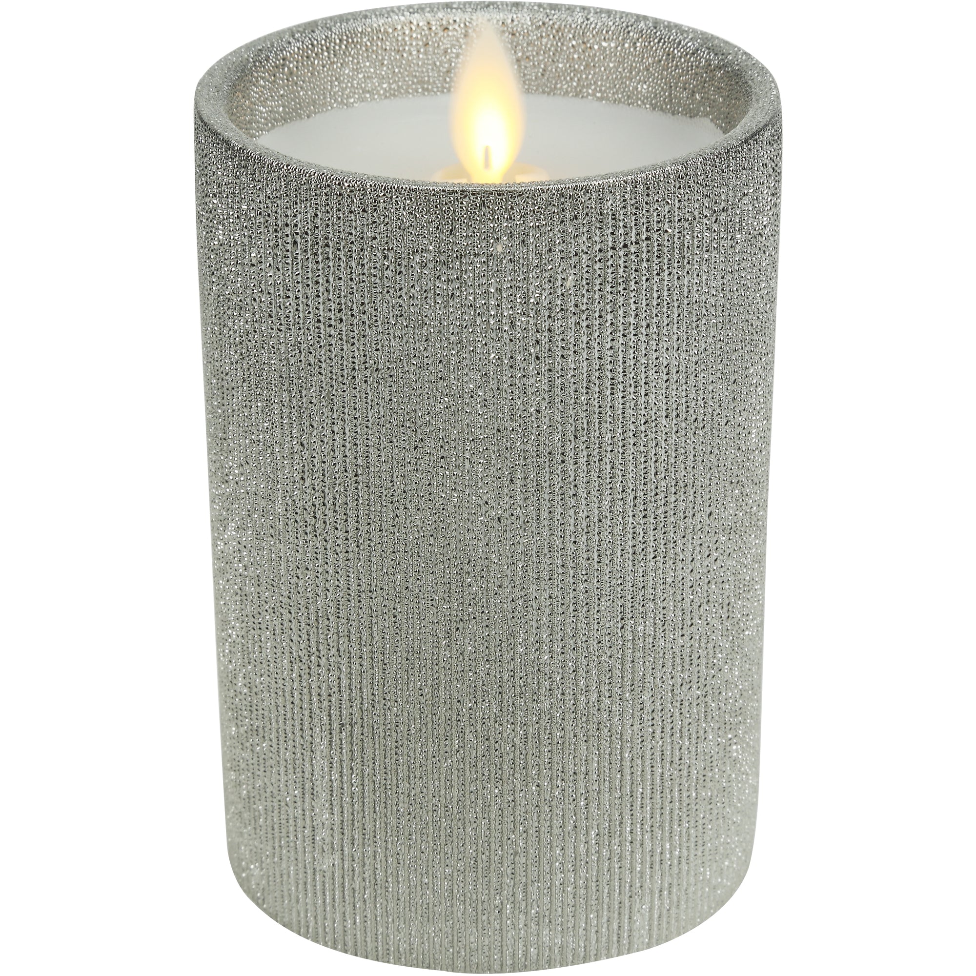 - IN-HOUSE DESIGN: "Love Lives Here" foil-wrapped text label is wrapped around the glitter candle using a silver cord.