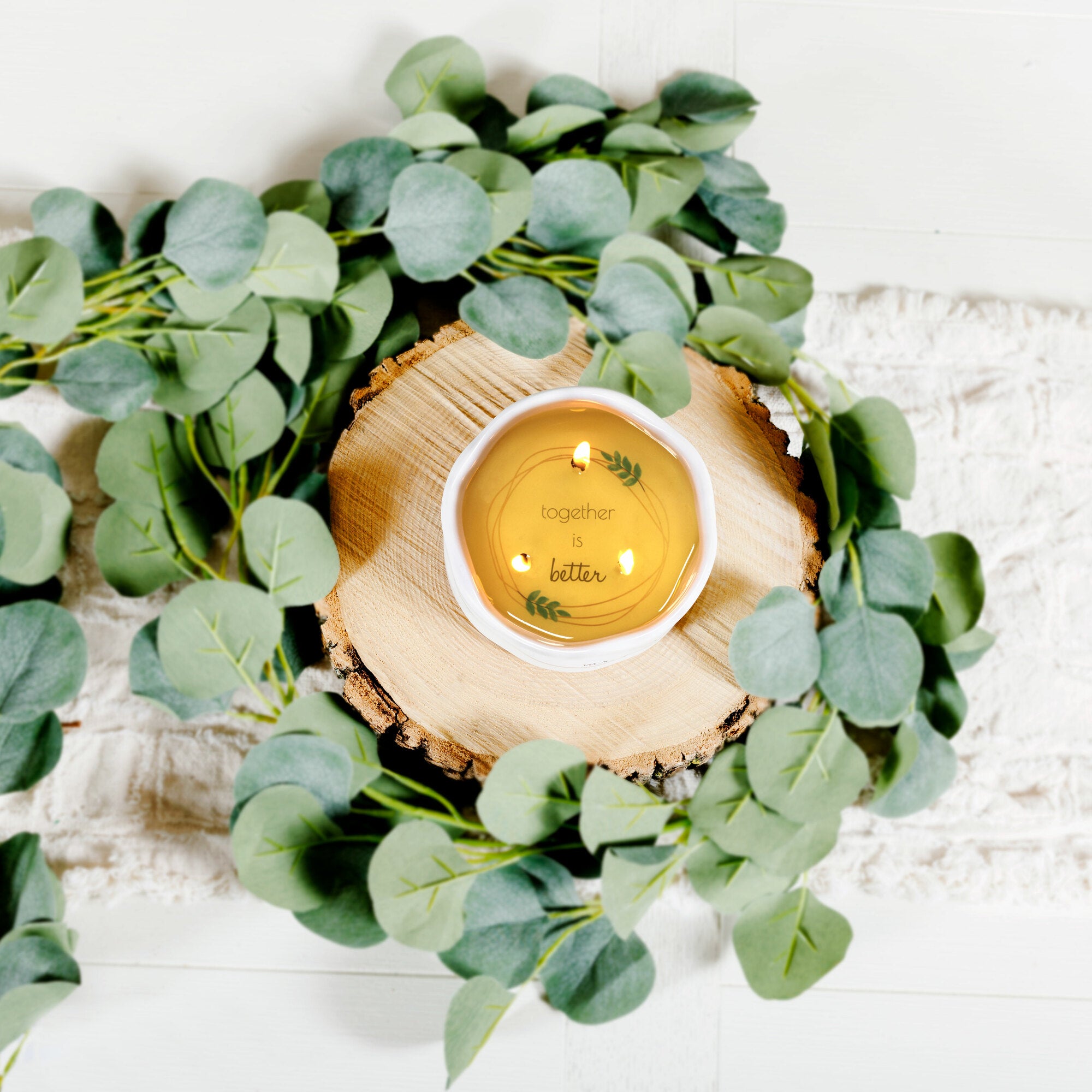 - IN-HOUSE DESIGN: The new & innovative candle offers a unique message for your loved one within the wax as time progresses. You will see cursive written "Together Is Better" sentiment after about 10 minutes. As you watch, the entire decal with an intertwining golden triple-string and leaf design will appear after 60 minutes. Then, the message will hide again and reappear with each burn. The front of the candles has a simplistic "Mr. & Mrs." decal accompanied by iridescent gray and metallic gold striped wrap-around patterns on a matte white exterior handmade feel vessel with a glossy interior.