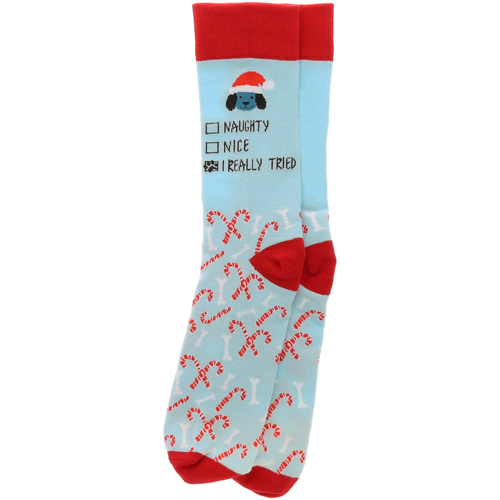 • IN-HOUSE DESIGN: These festive socks feature a holiday-themed cat graphic with the playful sentiment "Naughty - Nice - I really tried" on the outer ankle. The light blue background is adorned with red and white candy canes, creating a fun and festive look for the holiday season. The contrasting red heel, toe, and ankle add a bold pop of color, making these socks perfect for Christmas parties or cozy nights at home.