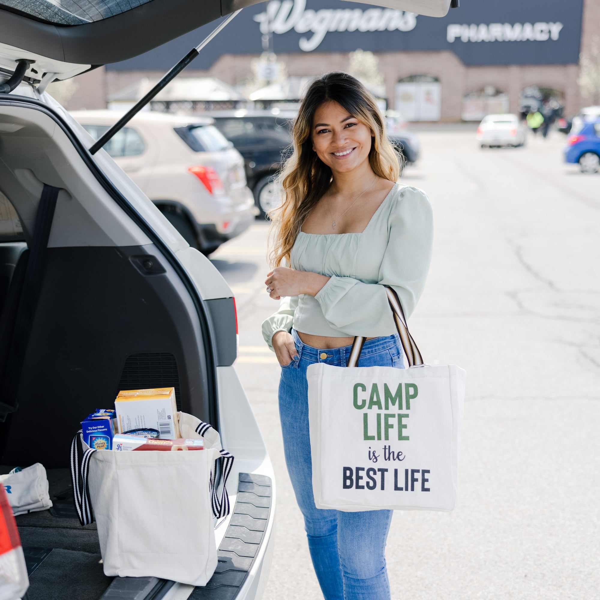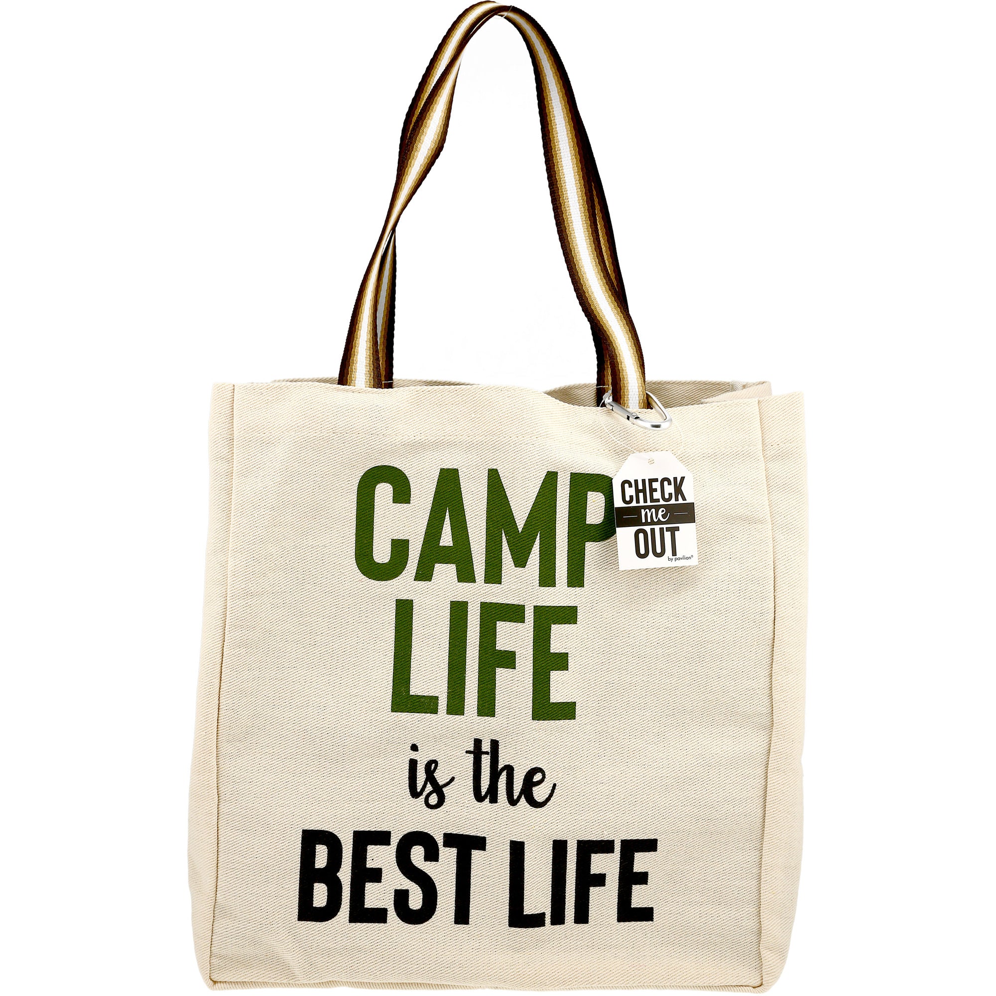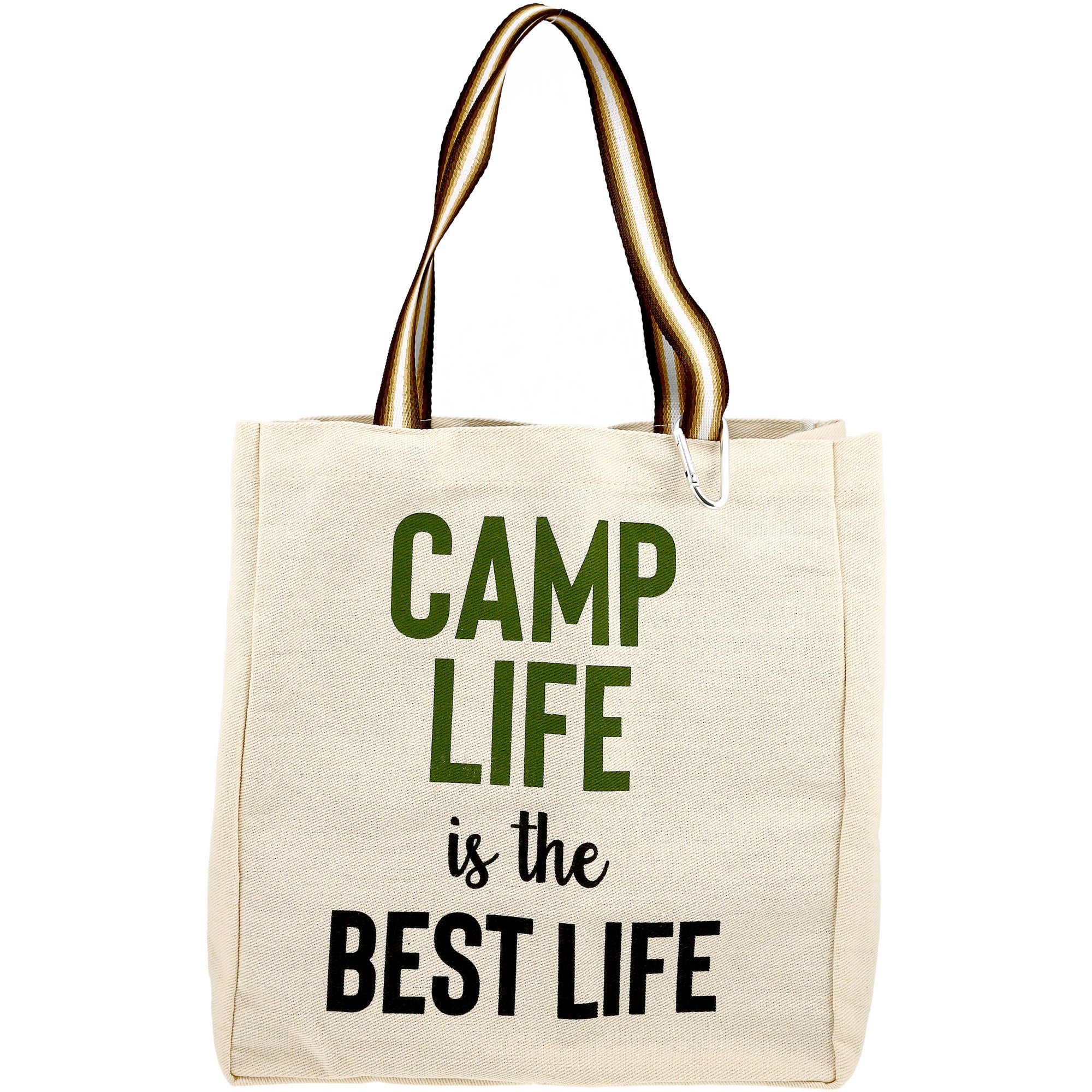 - IN-HOUSE DESIGN: "Camp Life Is The Best Life" green & black text is printed onto one side of the cream/beige neutral-colored shopping bag. The thick brown and white double-handle straps can help held on your forearm or shoulder and support ~15 pounds of food/drinks. The clip is NOT meant to hold items inside while shopping in the store and clipped to the cart. These economical lightweight cloth bags were created by our in-house artists to bring a little humor to your shopping experience.