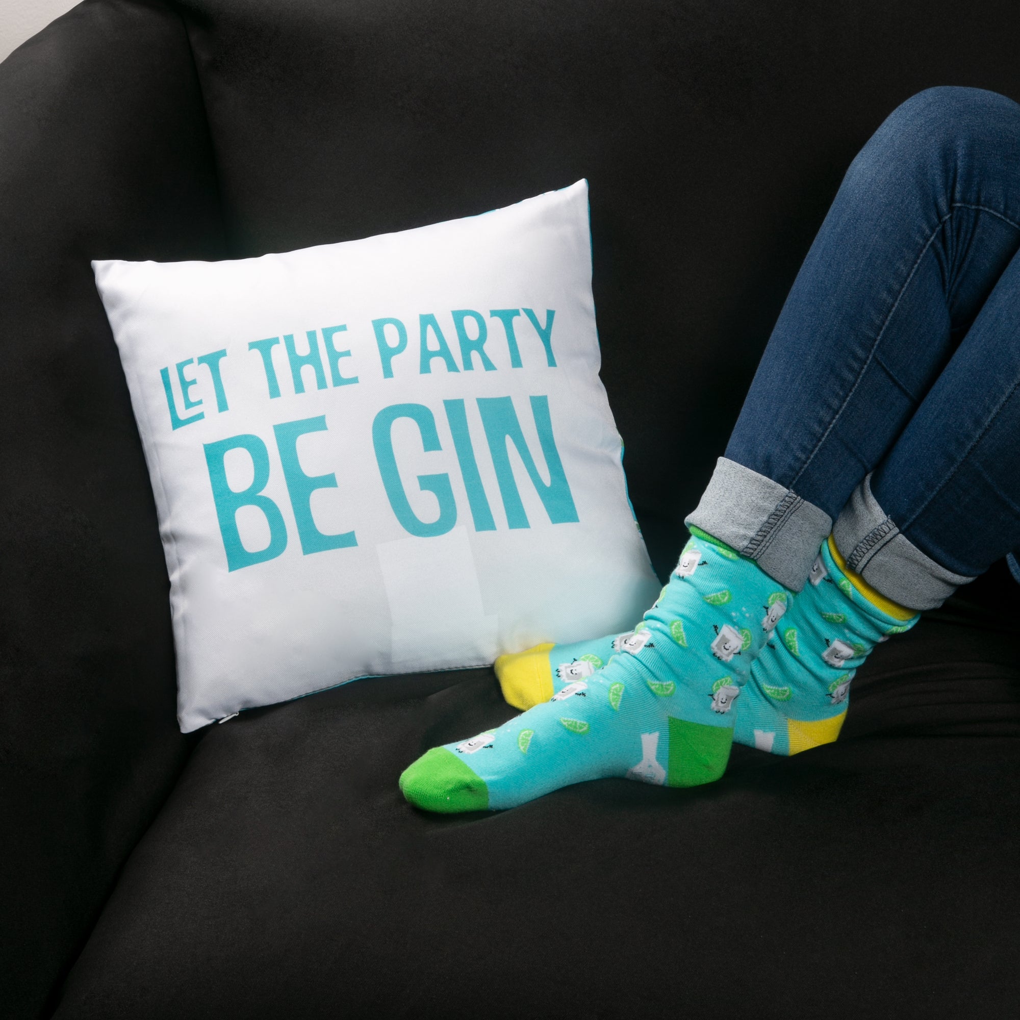 - IN-HOUSE DESIGN: "Let The Party Be Gin" text is printed on the front, while the back features a gin and tonic bottle and glass pattern.