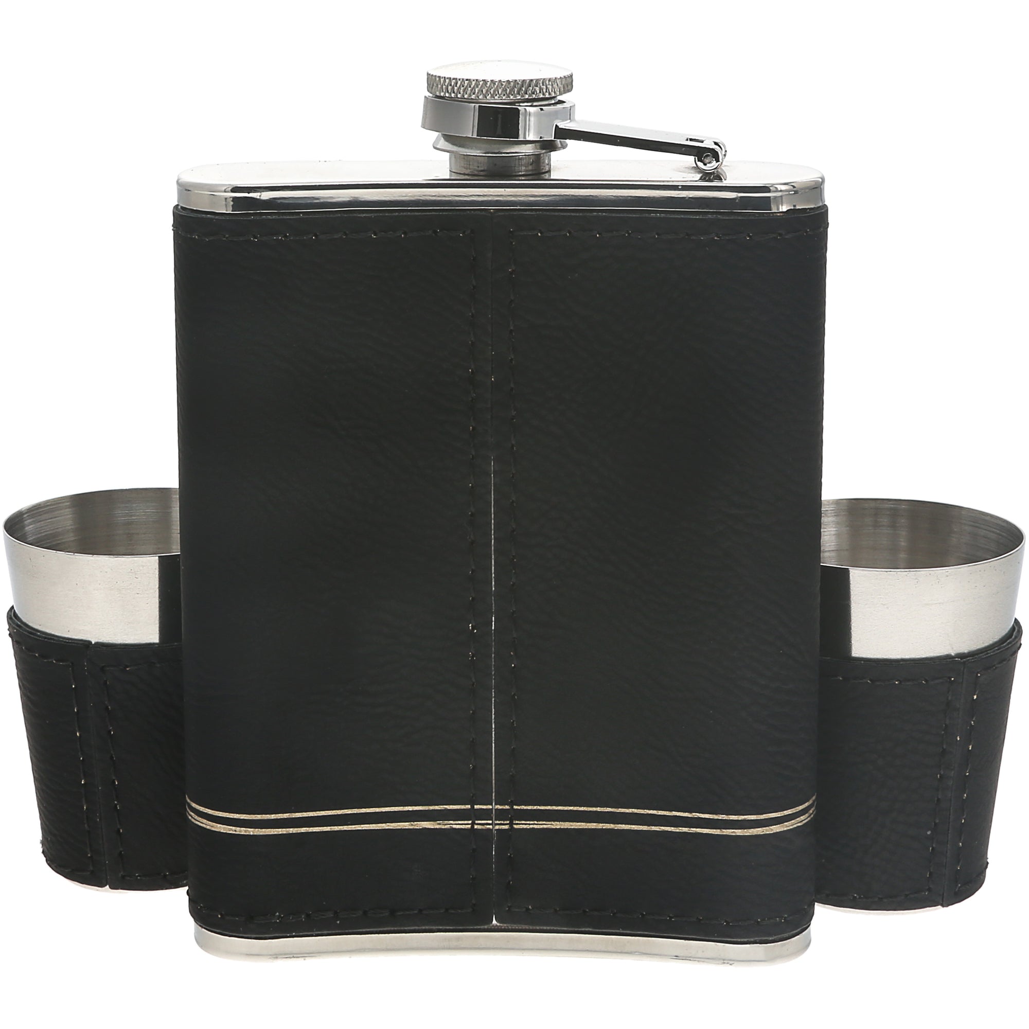 - PREMIUM QUALITY: Both the flask & shot glasses are made from stainless steel and stitched black, non-removable PU leather flask holds 8 oz of your favorite alcoholic beverage. Fold-over twist-top with textured easy-to-open lid edges secure closure for traveling. Shot glasses hold 2 oz of liquid.