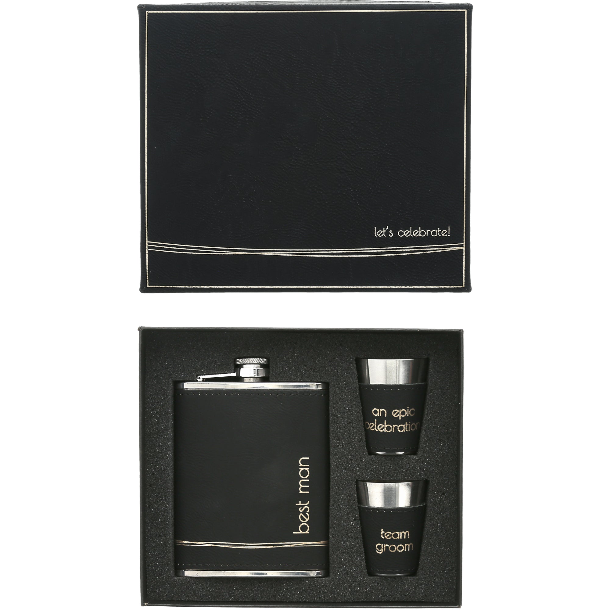 - IN-HOUSE DESIGN: The silver and black flask features a gold "Best Man" one-sided design that goes up the right side of the glass and a wrap-around three golden metallic intertwined string-like pattern towards the bottom. The first shot glass is black with gold "team groom" sentiment on the front center, whereas the other is black with gold "an epic celebration" sentiment on the front center. All words are laser engraved.