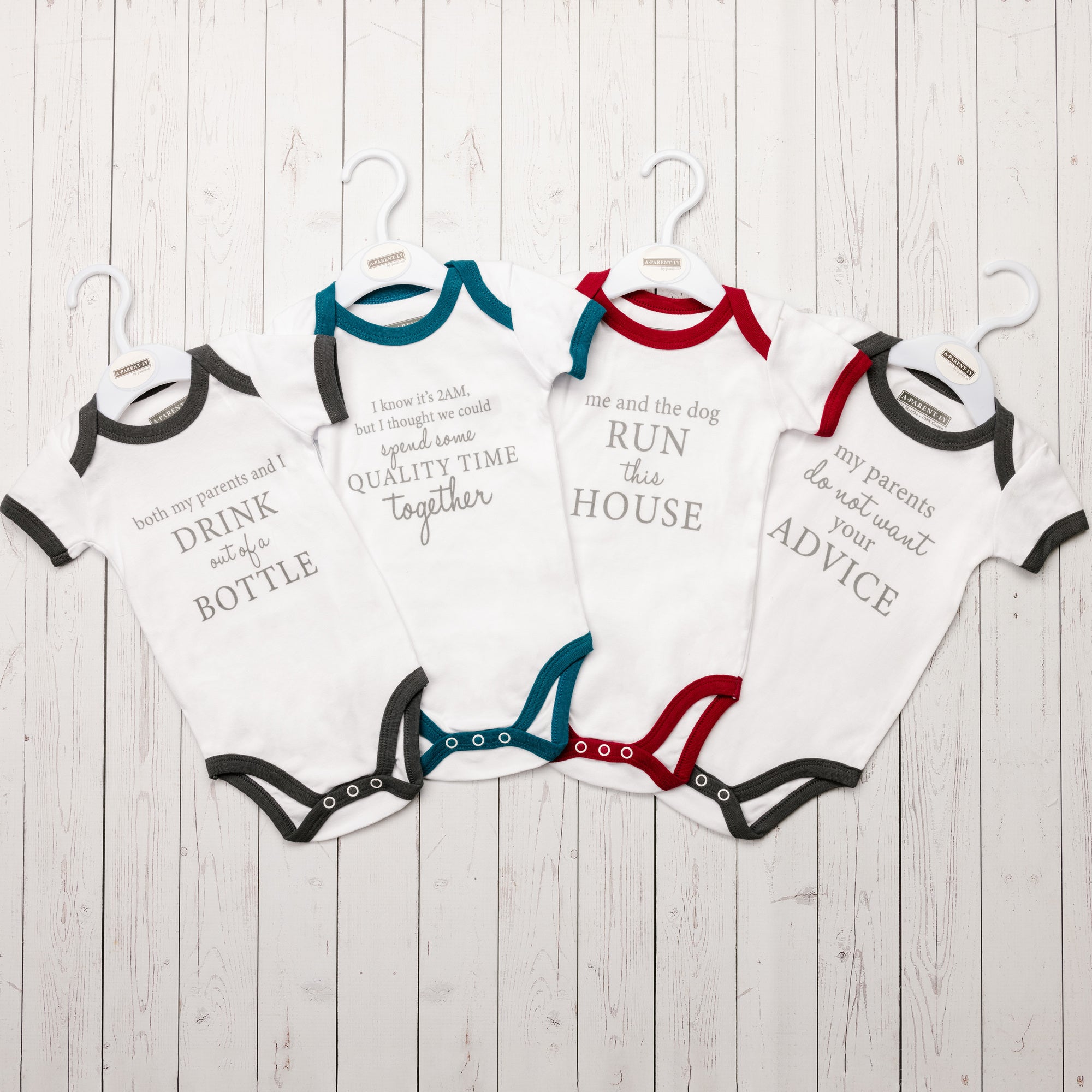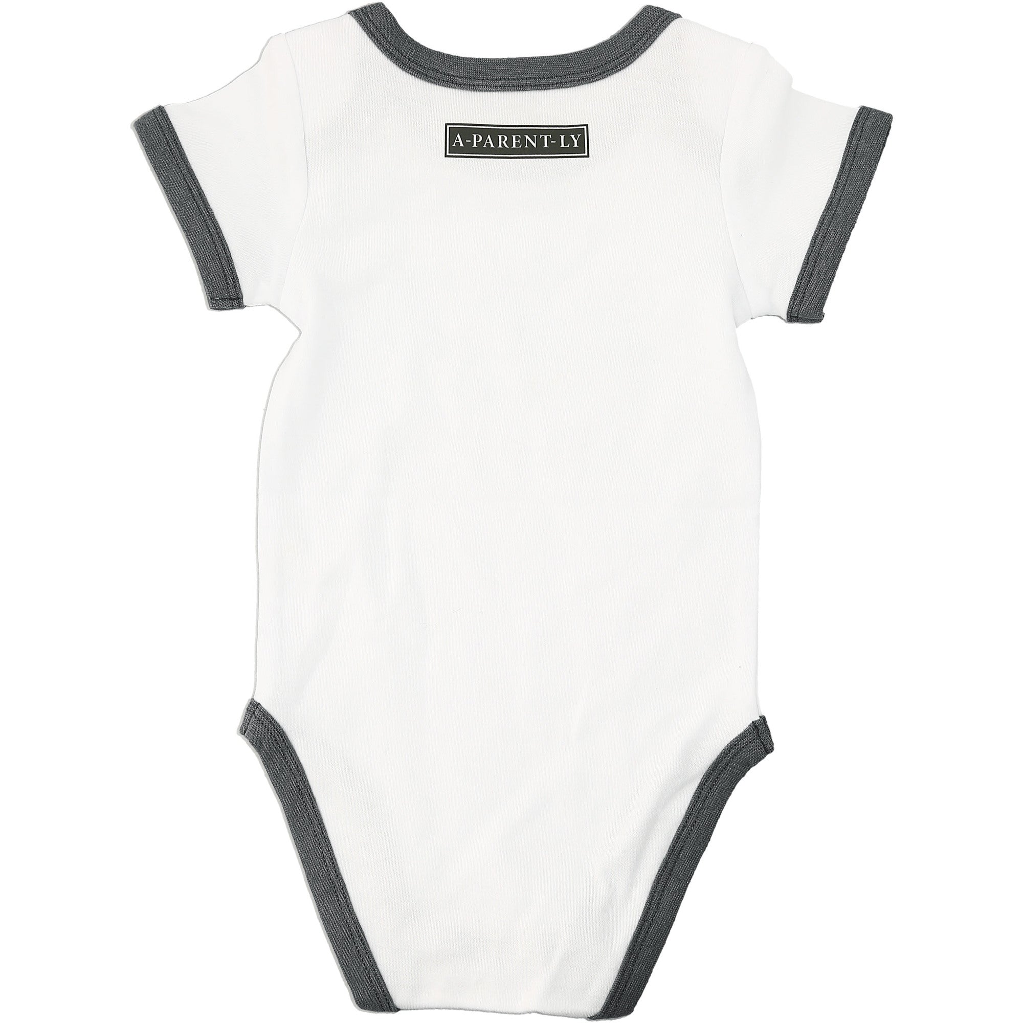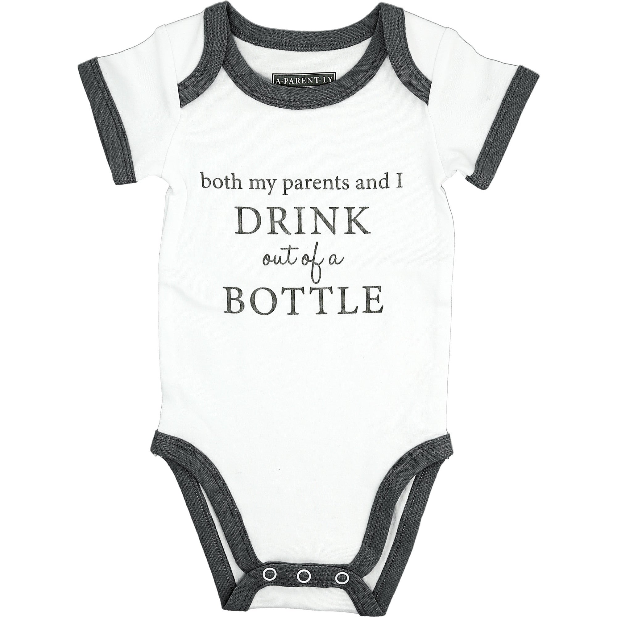 - IN-HOUSE DESIGN: Gray trimmed edges surround the neck, arms, and thighs. The "Both My Parents And I Drink Out Of A Bottle" screen-printed sentiment is on the front center of the bodysuit. Itch-free tagless sizing is printed on the interior collar. The center upper back features a light gray logo.