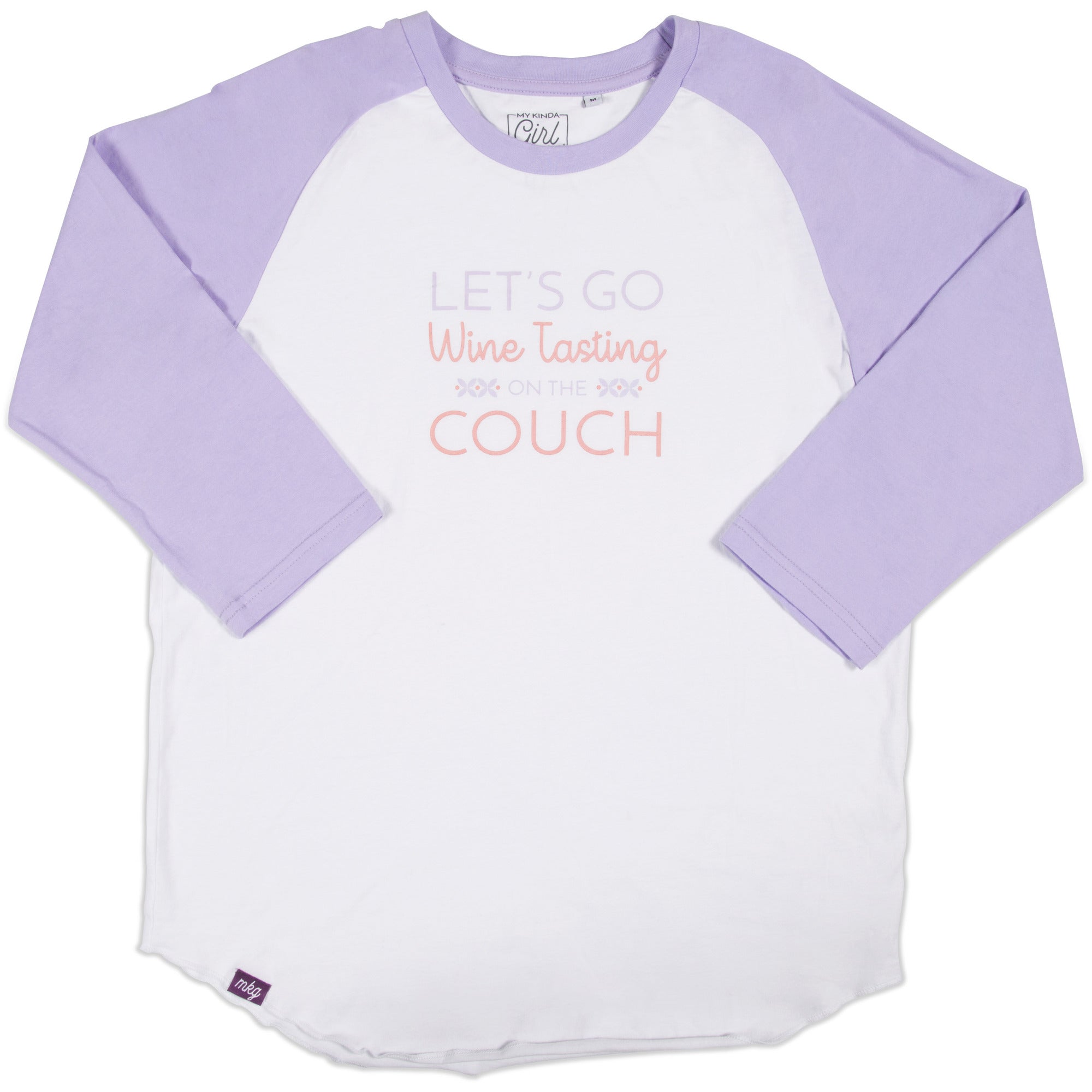 - IN-HOUSE DESIGN: "Let's Go Wine Tasting On The Couch" text is printed onto the front of the shirt.