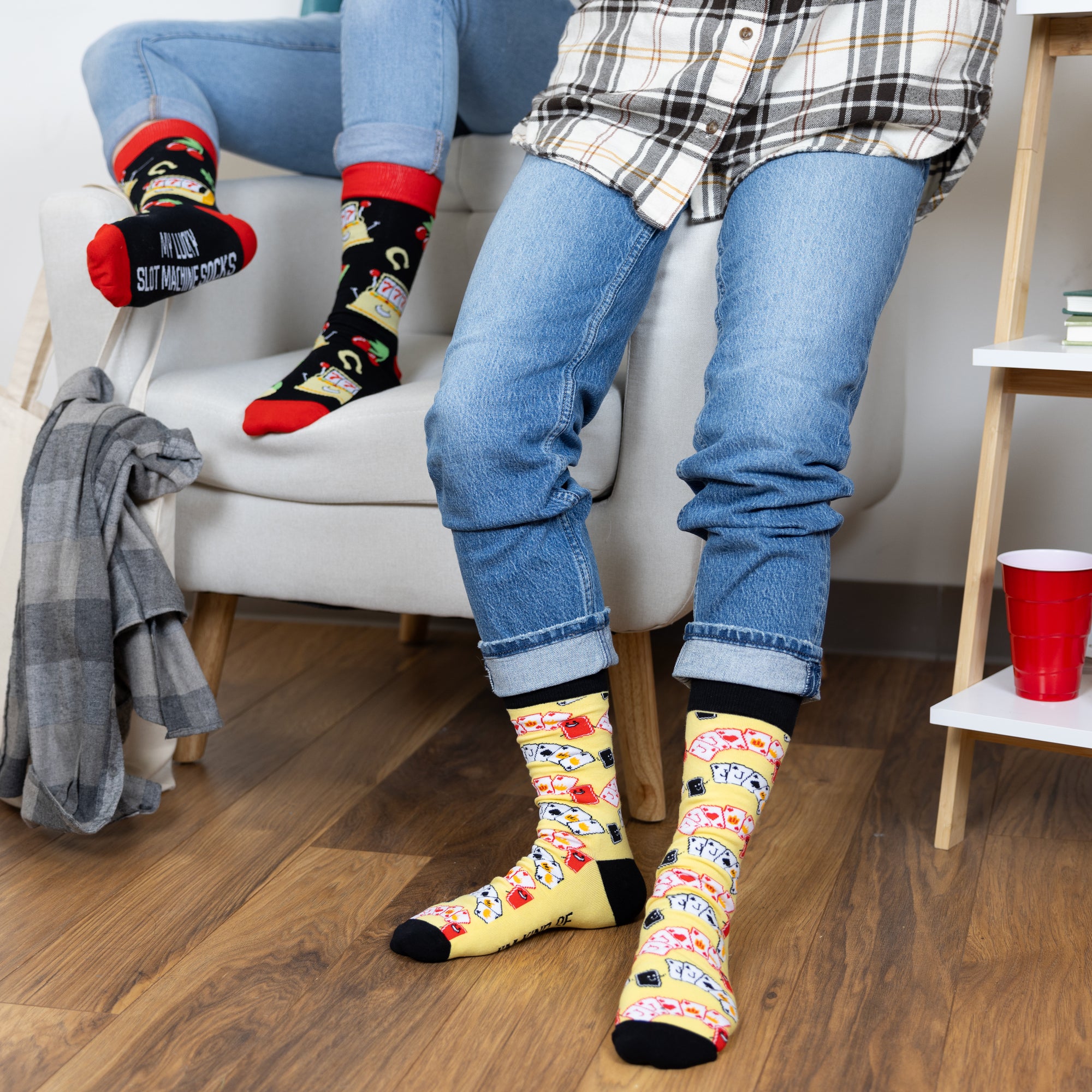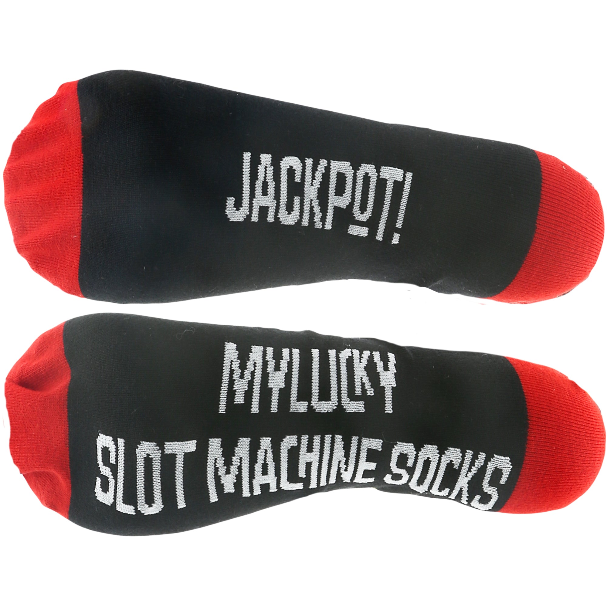 - IN-HOUSE DESIGN: The ankle, heel & toe are red, whereas the center portion is black with happy and celebratory dancing black, white, green, yellow, and red slot machines/horseshoes/four-leaf clovers/cherries neatly spread in repetitive pattern surrounding the ankle and the top portion of the foot. The sole of each sock features a different sentiment, "Jackpot!" and "My Lucky Slot Machine Socks" in an all-caps white sans serif font.