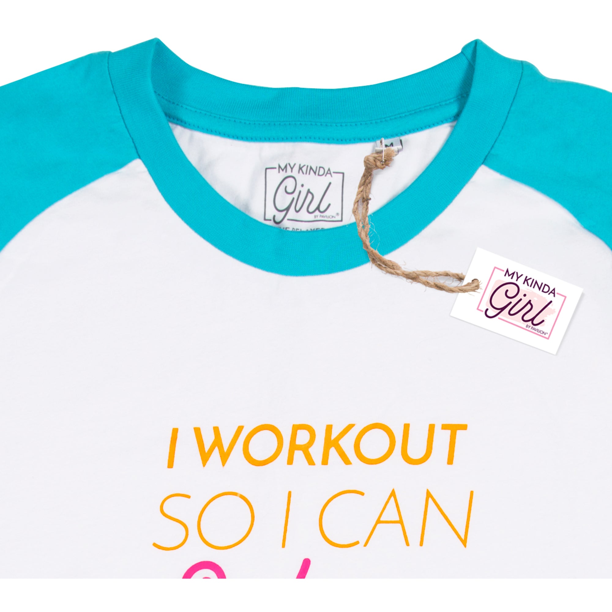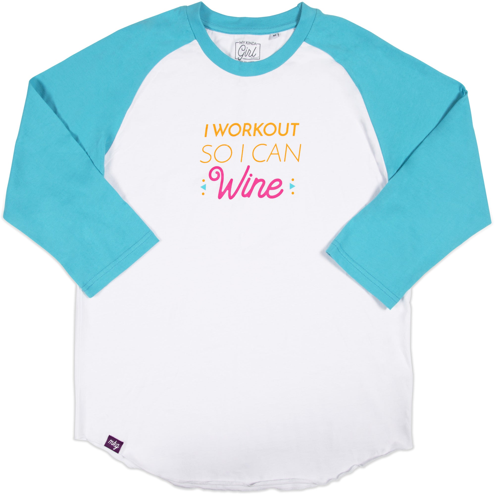 - IN-HOUSE DESIGN: "I Workout So I Can Wine" text is printed onto the front of the shirt.