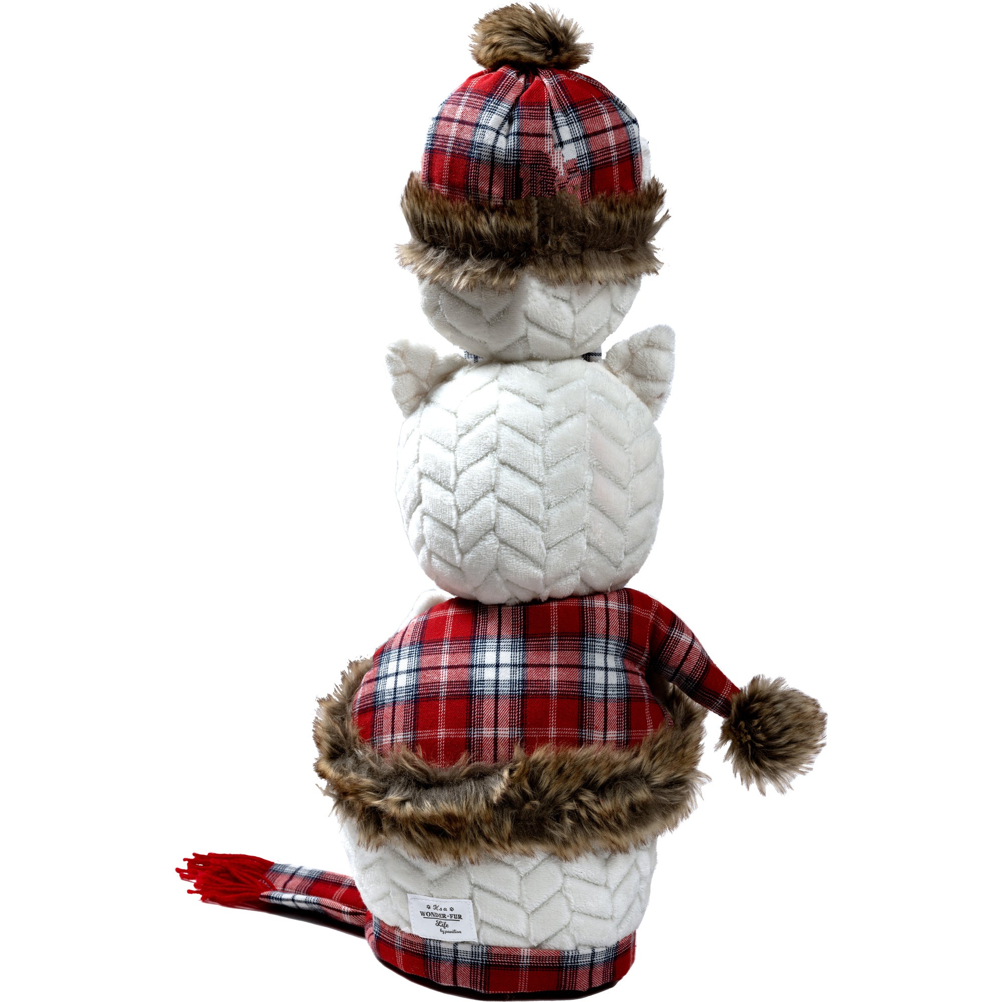 - PREMIUM QUALITY: The set of three cats have black embroidered faces with felt pink noses and plastic black and gray eyes. Each of the cats has different headwear, including bows and winter hats. The golden bell at the bottom is made from metal. Whereas the red plaid details and debossed white chevron patterns are made from 100% polyester. The interior has fluffing, weighted beads, and a felt bottom to protect floors and hardwood surfaces.