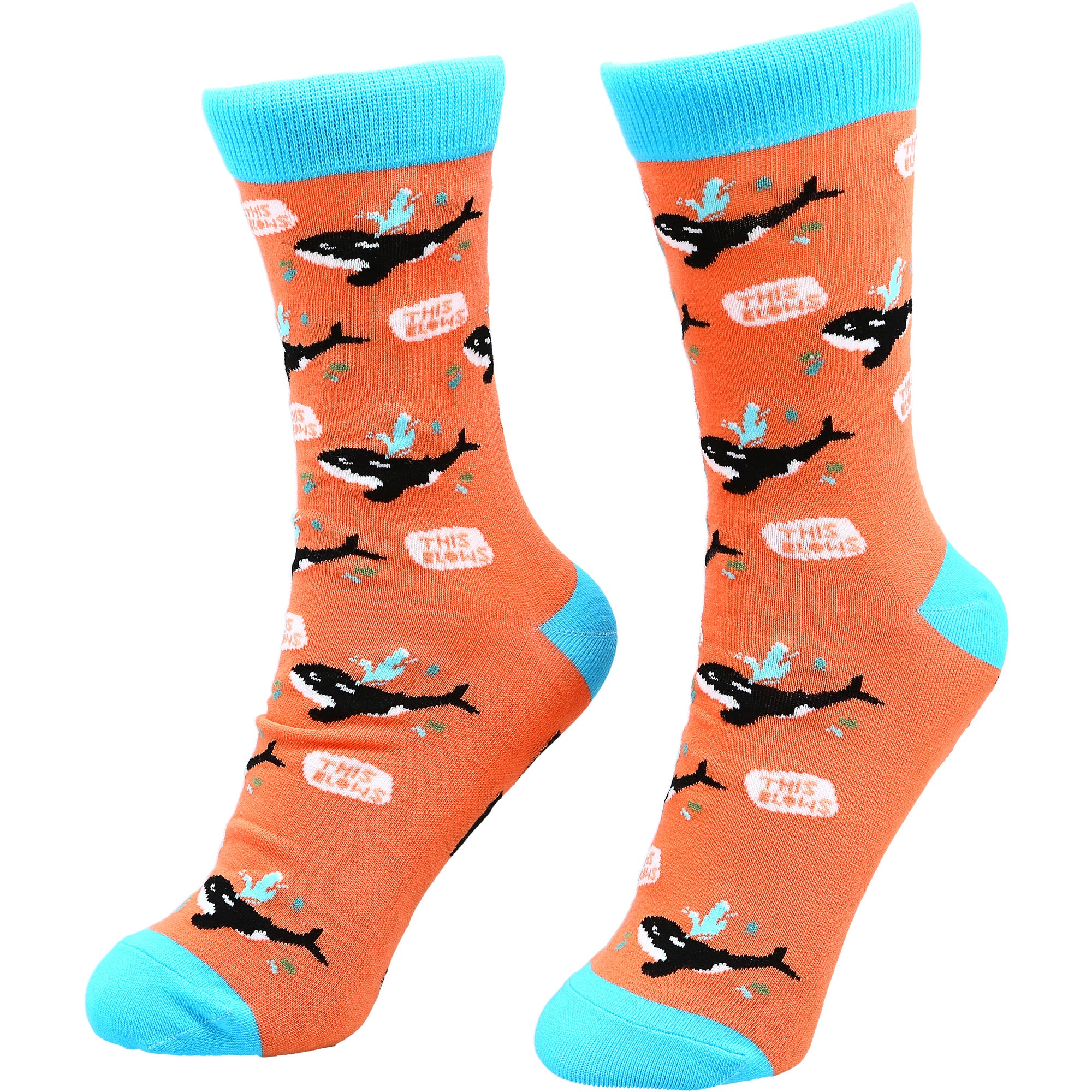 - IN-HOUSE DESIGN: "Mornings Blow" text is sewn into the base of the socks and is accompanied by a orca pattern with "That Blows" text.