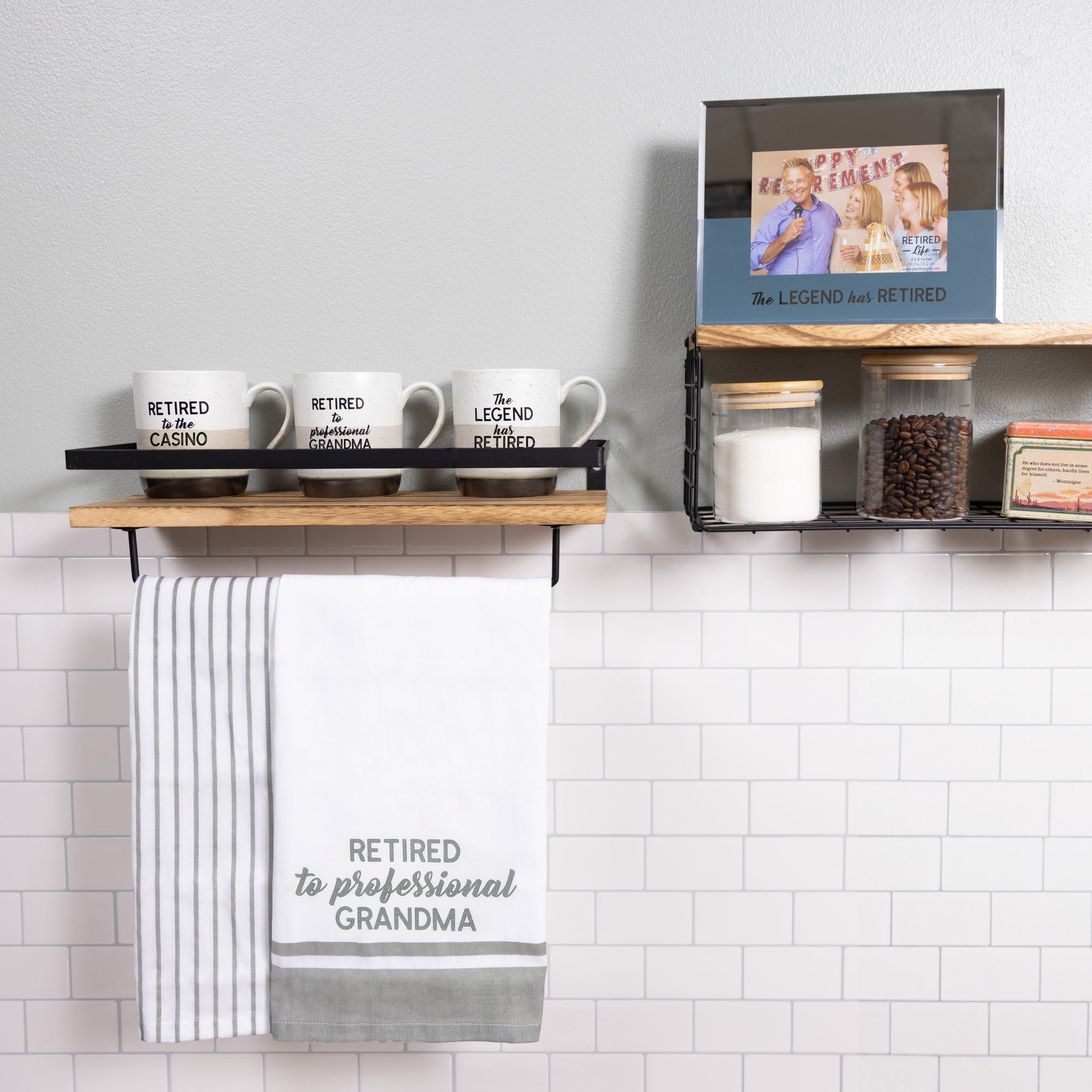 - IN-HOUSE DESIGN: Each towel bears its own design. The one towel has a gray vertical striped pattern. The second towel has a gray bottom with a "Retired To Professional Grandma" sentiment.