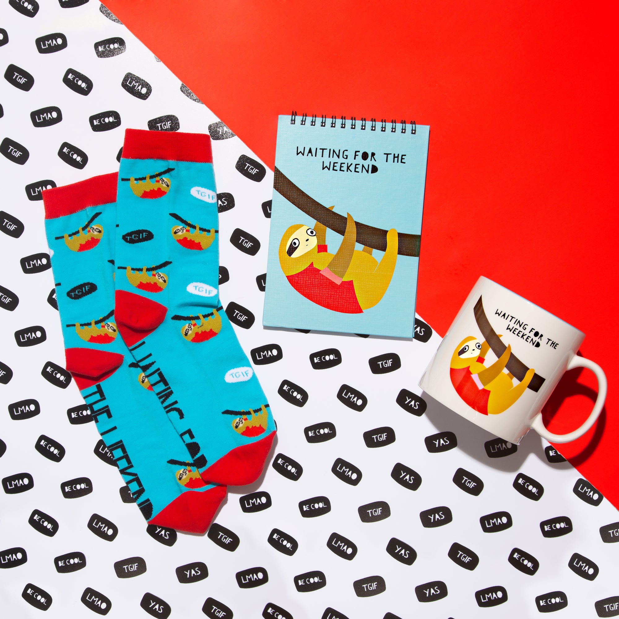 - IN-HOUSE DESIGN: "Waiting For The Weekend" text is sewn into the base of the socks and is accompanied by a sloth pattern with "TGIF" text.