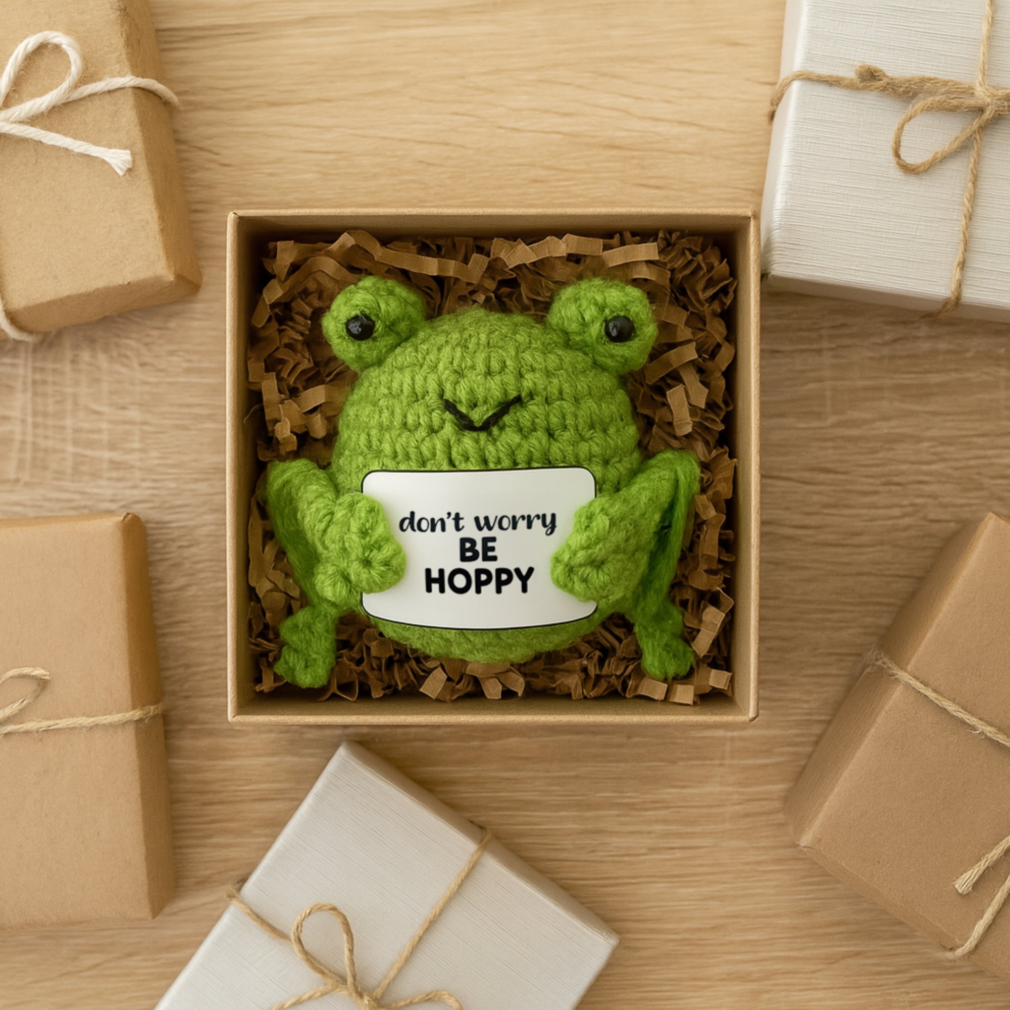 • IN-HOUSE DESIGN: This bright green frog features a plump belly, expressive bead eyes, and a stitched smile full of positivity. It holds a crocheted sign with the message “Don’t worry—be HOPPY,” a punny sentiment that makes this figure both charming and encouraging. Its little legs, blushed cheeks, and raised arms create a sense of motion and joy, as if the frog is mid-hop to bring happiness to your day.