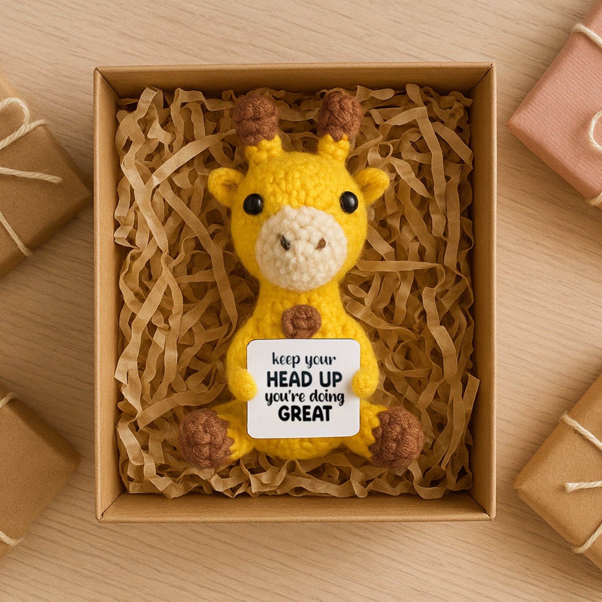- IN-HOUSE DESIGN: The adorable crochet giraffe holds a sentiment card reading: “Keep You Head Up—you’re doing GREAT.” Bright yellow and orange coloring with pink cheeks and a wide smile make this giraffe a joyful boost for any room.