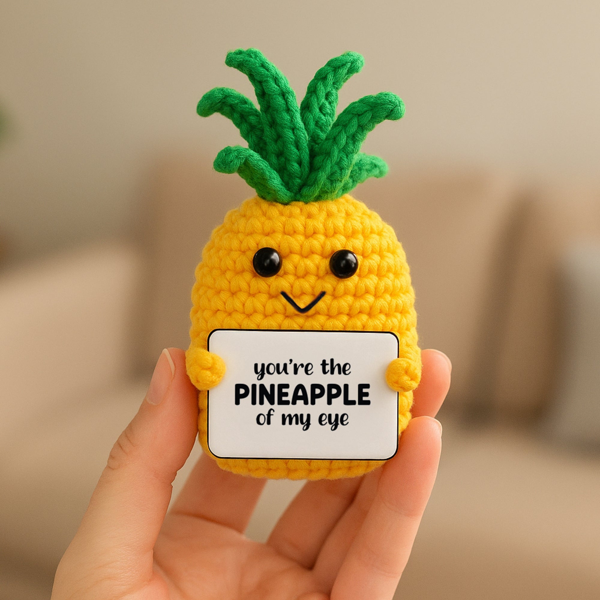 - IN-HOUSE DESIGN: Holding a stitched sentiment that reads, “You’re the PINEAPPLE of my eye,” this friendly fruit features a bright smile, structured leaf crown, and a joyful spirit. Every detail—from its ribbed texture to its cheerful face—was made to spread love and warmth.