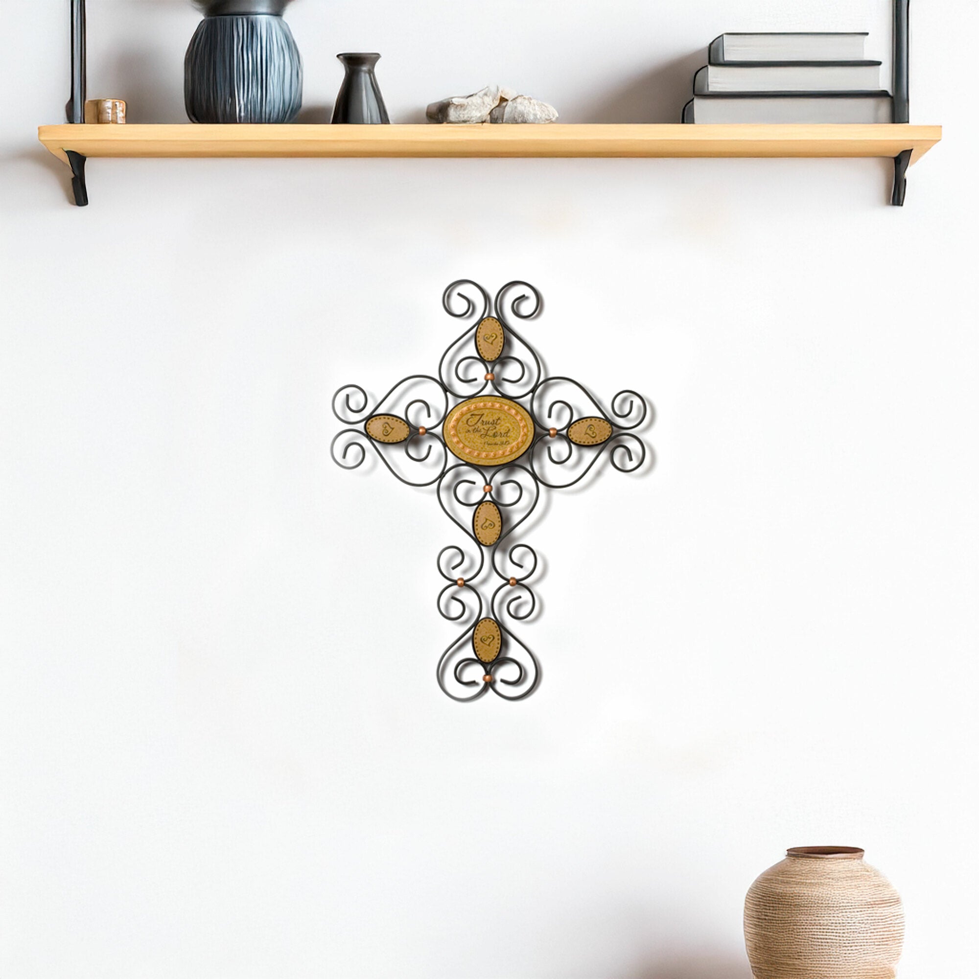 • PREMIUM QUALITY: This 9" cross-shaped wall hanging is meticulously crafted from high-quality metal and wood, ensuring durability and a timeless look. The intricate scrollwork design adds an elegant and decorative touch, making it a standout piece in any room. It is securely packaged in a printed box, making it perfect for gifting or safekeeping.