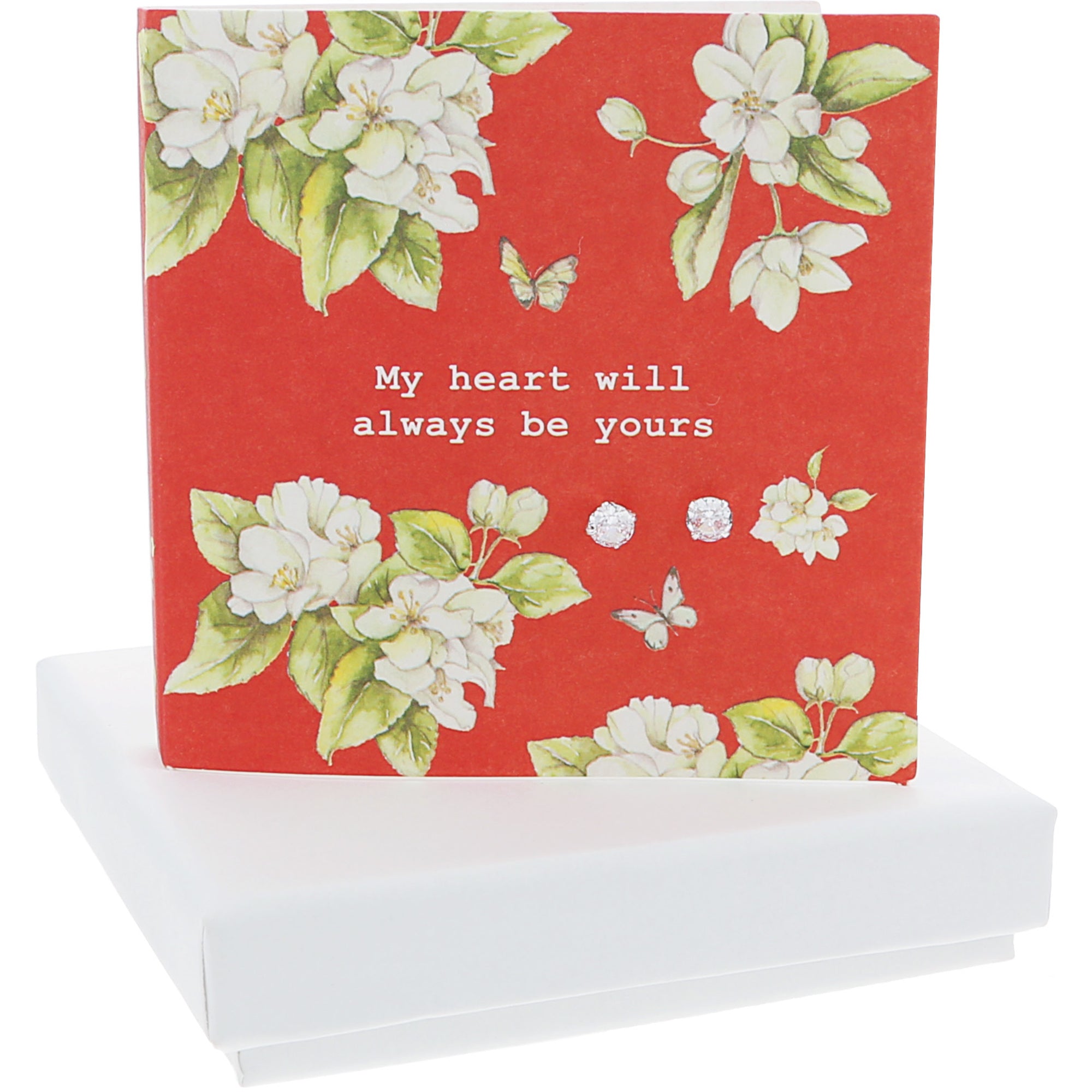 - IN-HOUSE DESIGN: The printed card has a red background and a beautiful magnolia floral and butterfly design. The earrings are strategically placed within the florals. The typewritten white "My Heart Will Always Be Yours" sentiment is placed in the center of the greeting card.