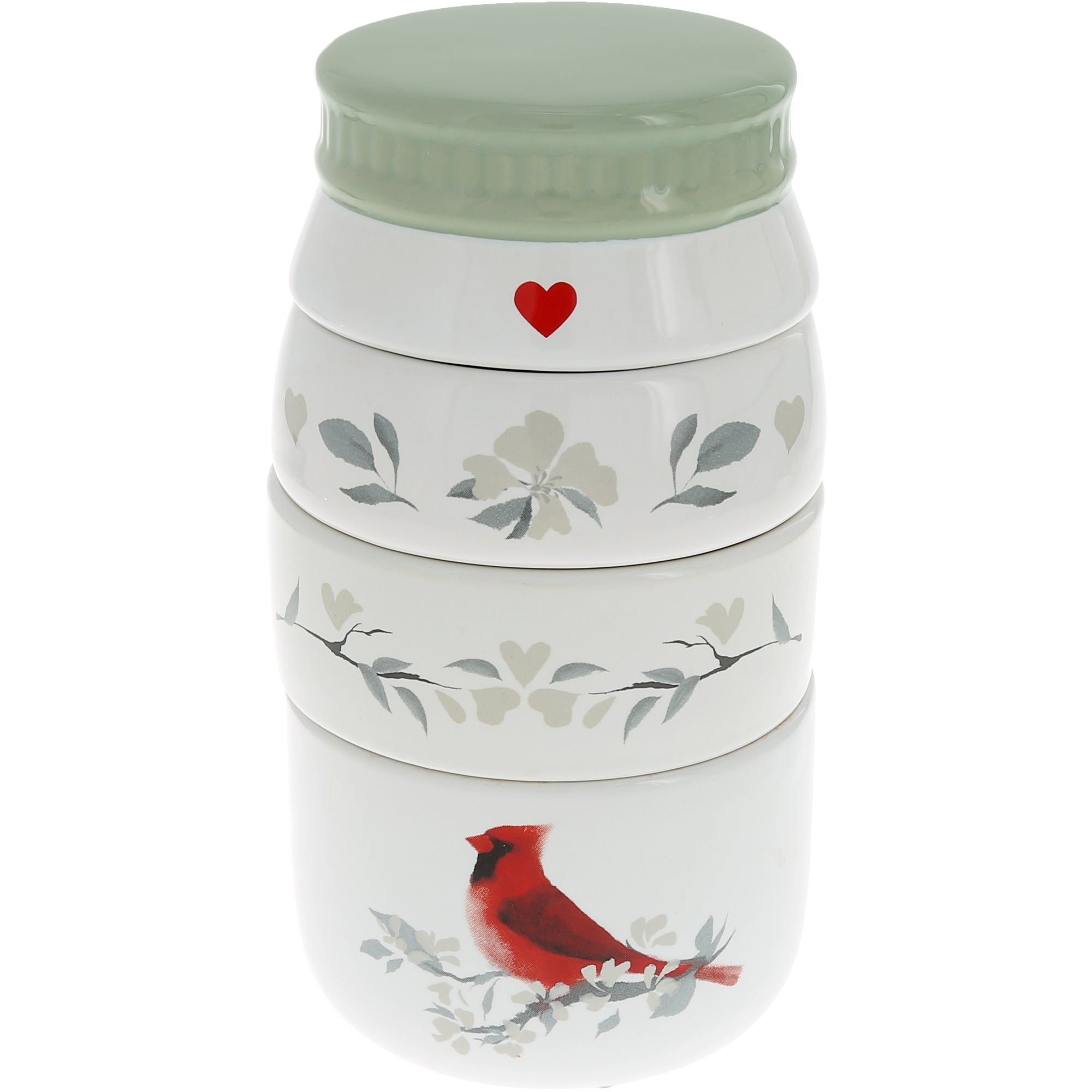 - PREMIUM QUALITY: Crafted from durable ceramic with a glossy glaze, this 6.75" stackable measuring cup set combines functionality with heartfelt artistry. The set includes four measuring cups that neatly stack to form a jar-shaped display featuring a vibrant red cardinal perched on delicate watercolor branches. Each cup is printed with measurement markers inside and soft botanical artwork outside for a cohesive, elegant look. Packaged in a custom wrap and protective white die-cut box for secure gifting or storage.