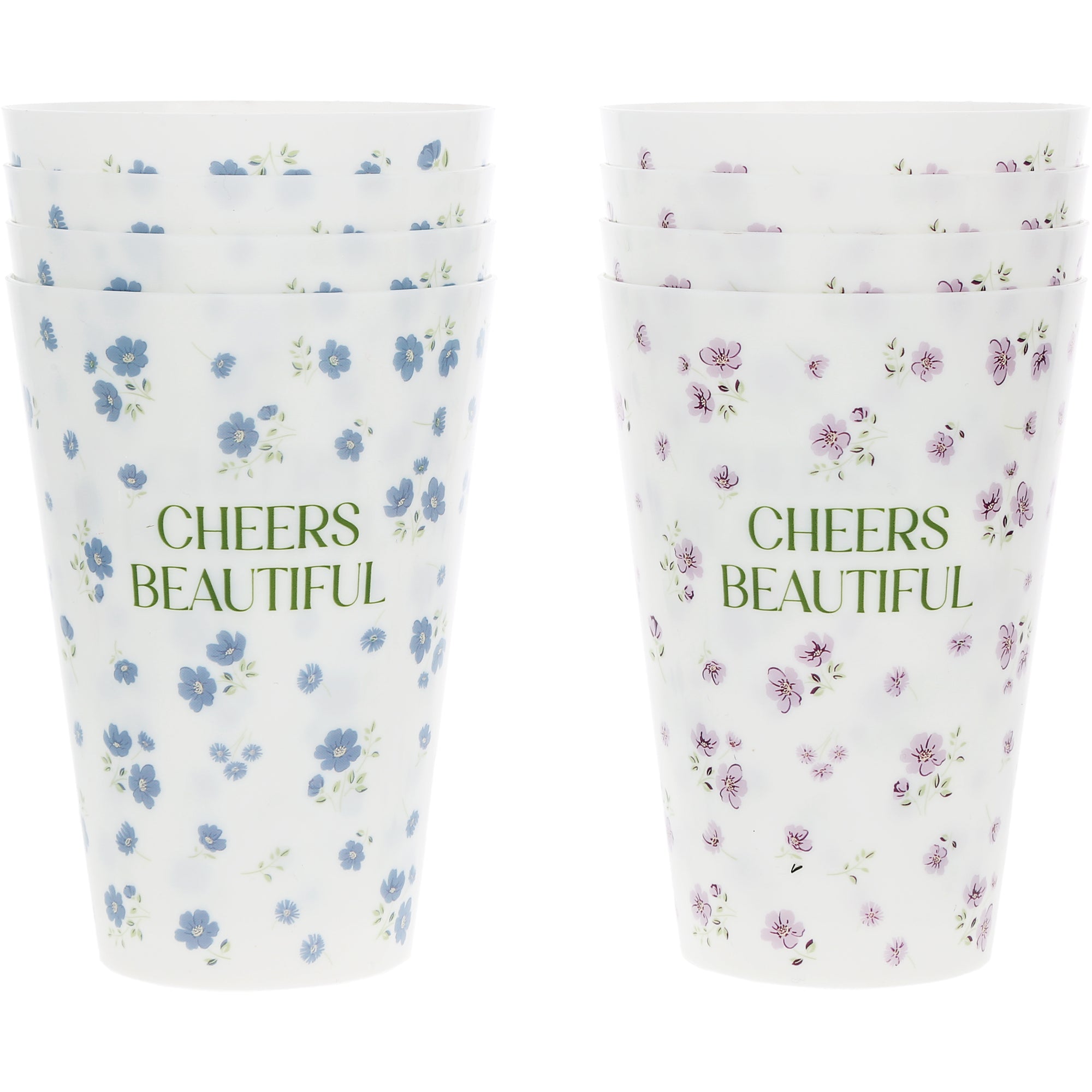 - PREMIUM QUALITY: This set of eight 16 oz reusable plastic cups is made from durable, BPA-free plastic—safe, lightweight, and easy to handle for any occasion. Each set includes two charming wraparound floral designs, four in soft blue and four in lavender purple, all printed with crisp detail for long-lasting use. Perfect for both indoor and outdoor gatherings, these sturdy cups combine beauty and practicality for everyday hydration or festive entertaining. Dishwasher safe (top rack) for easy cleaning.