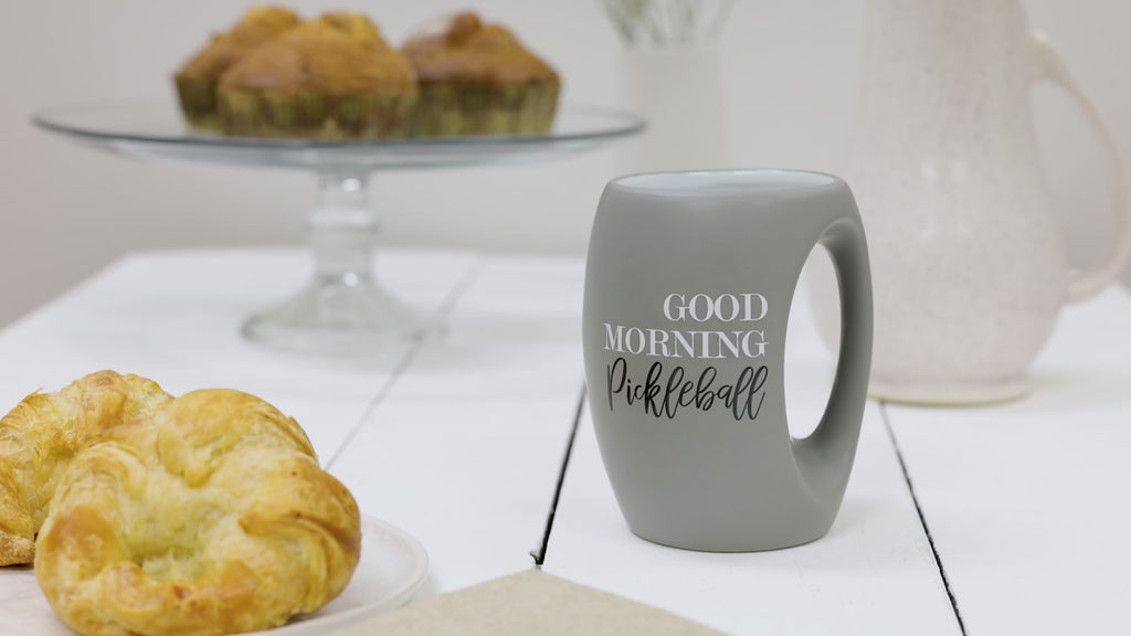 - IN-HOUSE DESIGN: "Good Morning Pickleball" white and black sentiment decal on the front side of the matte gray cup. The Interior is white and has a glossy glaze prop 65 food-safe finish. We designed and created this mug to blend in with any of your kitchen's current drinkware collections with a refined, modern, and aesthetically pleasing look paired with humor and relatable sentiment.