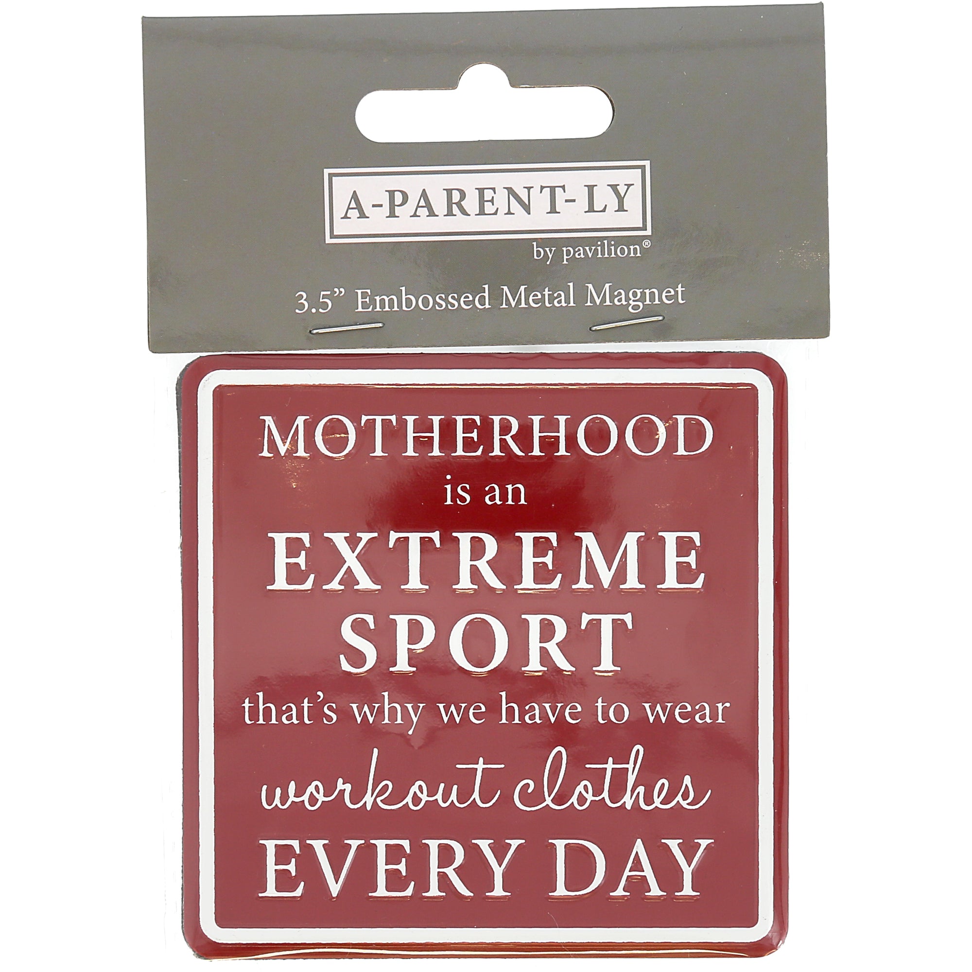 - IN-HOUSE DESIGN: The white embossed “Motherhood Is An Extreme Sport That’s Why We Have To Wear Workout Clothes Every Day” sentiment and outside border make this simplistic design stand out on the solid burgundy red background.