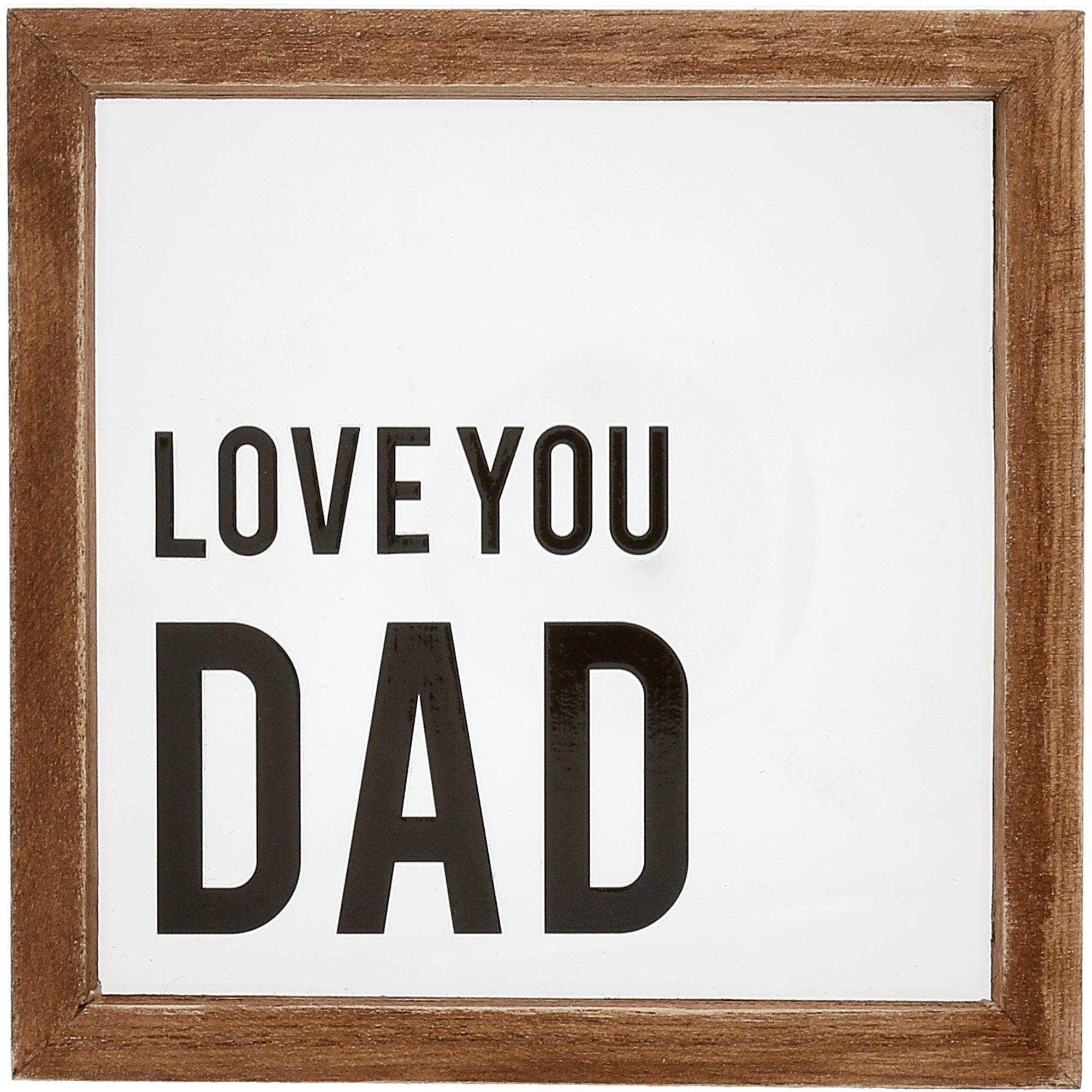 - PREMIUM QUALITY: This 5" x 5" plaque features a dark wood-stained frame and a clear glass panel with the simple and heartfelt phrase “Love You Dad.” Comes with a metal sawtooth hanger and can also stand on its own.