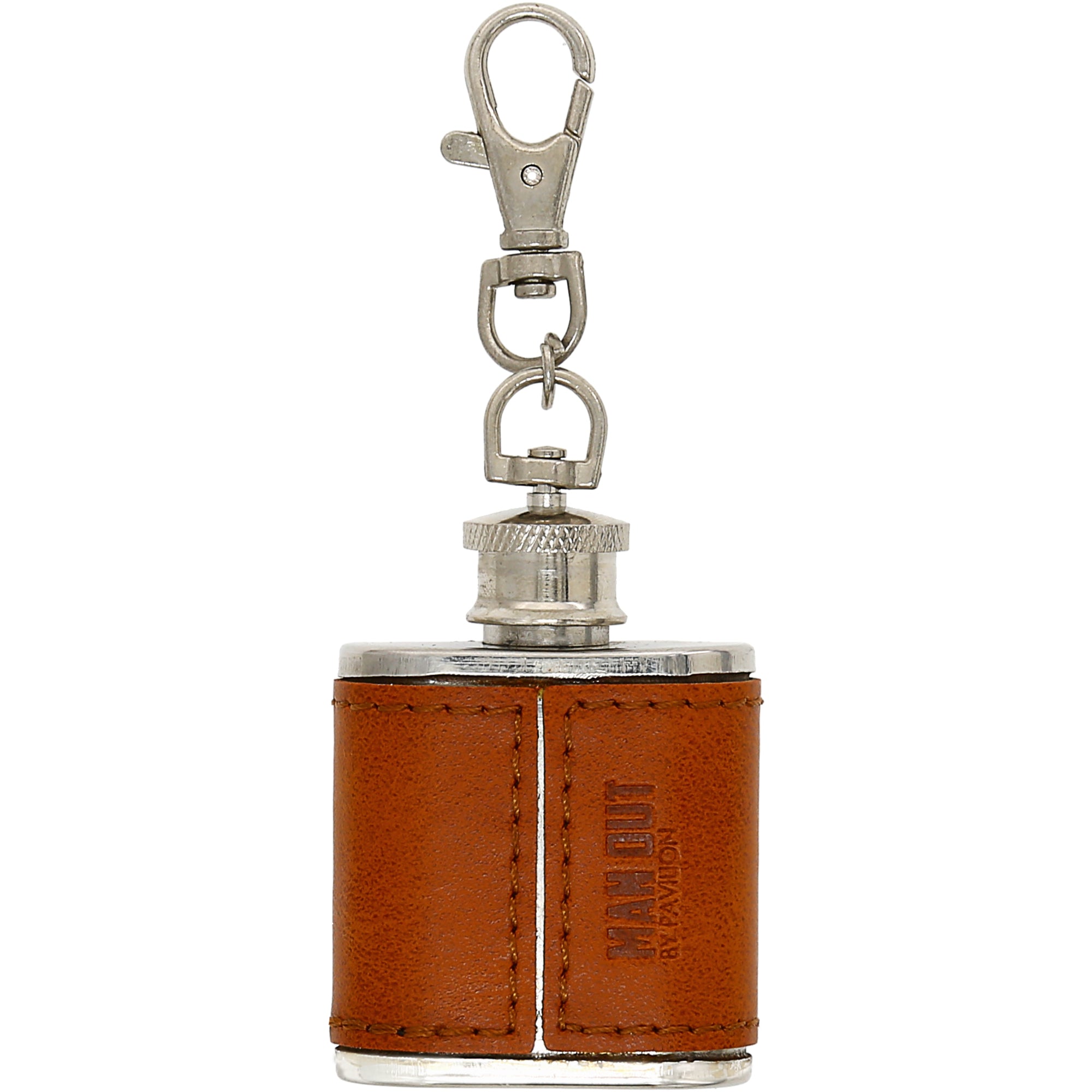 - PREMIUM QUALITY: This 1 oz mini flask is constructed from a lobster-claw closure stainless steel silver hardware keychain which is attached to a screw-on lid that has a textured brim for easy grip. The wrap-around brown PU leather cover is stitched with brown string.