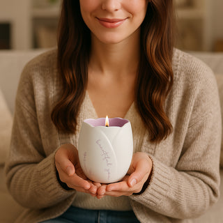 - PREMIUM QUALITY: This 8 oz flower-shaped stoneware candle is crafted from high-quality materials with a soft organic wave shape. It features lavender-scented soy wax with a 100% cotton wick for a clean, even burn. The exterior has a smooth matte finish, while the interior is glazed for a glossy look. Designed to create a calming atmosphere, this candle is both functional and decorative, making it a timeless keepsake.
