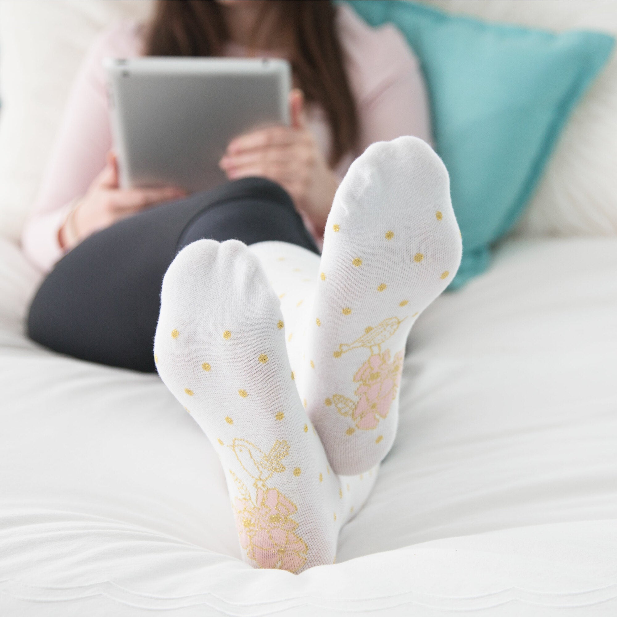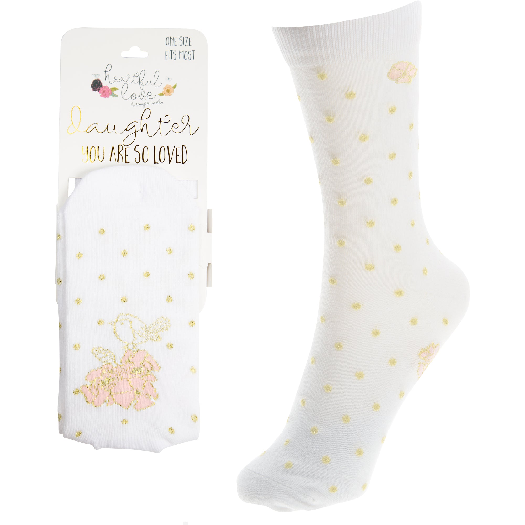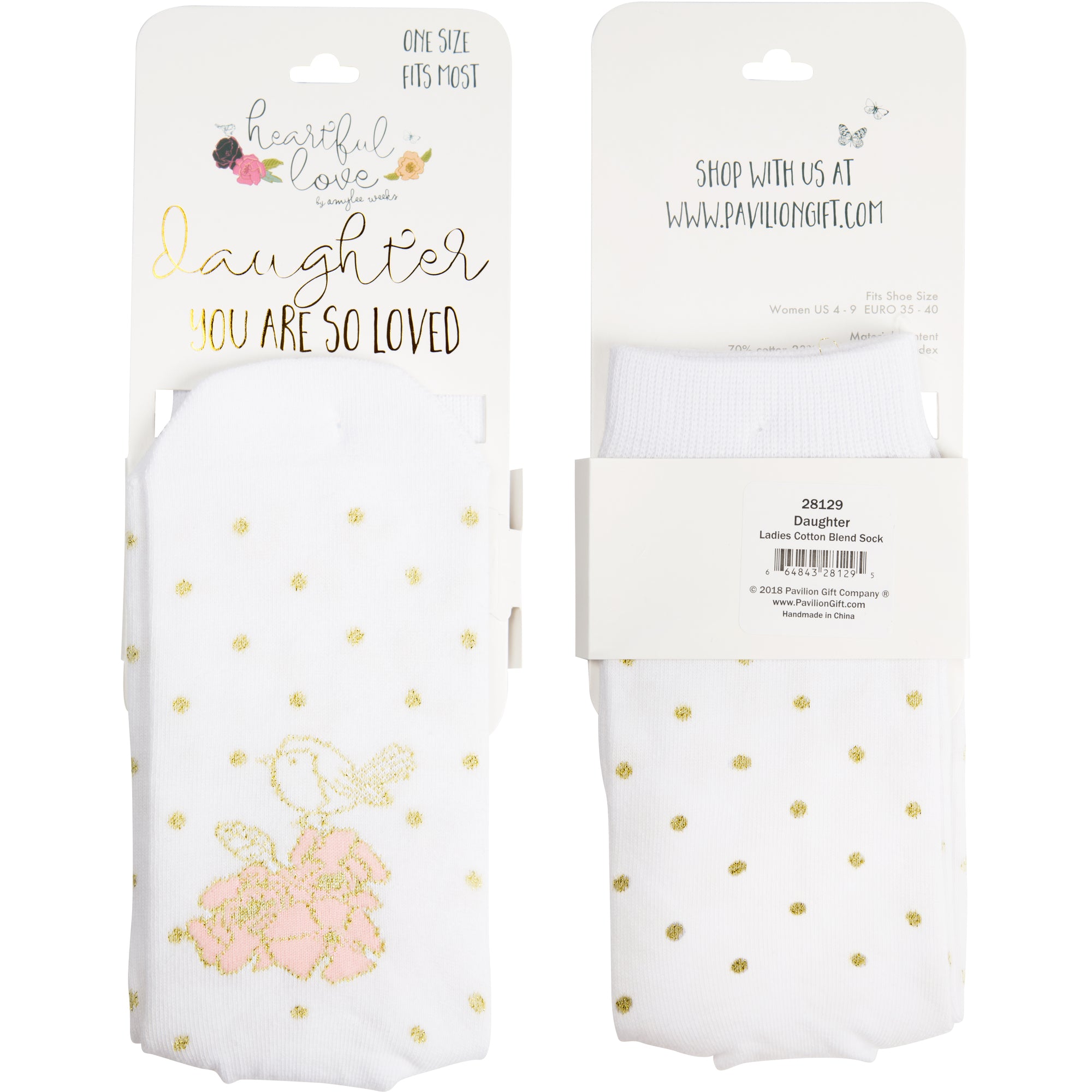 - IN-HOUSE DESIGN: "Daughter; You Are So Loved" text is printed onto the cardboard holder, whereas the accompanying bird and floral designs are sewn into the side of each sock.