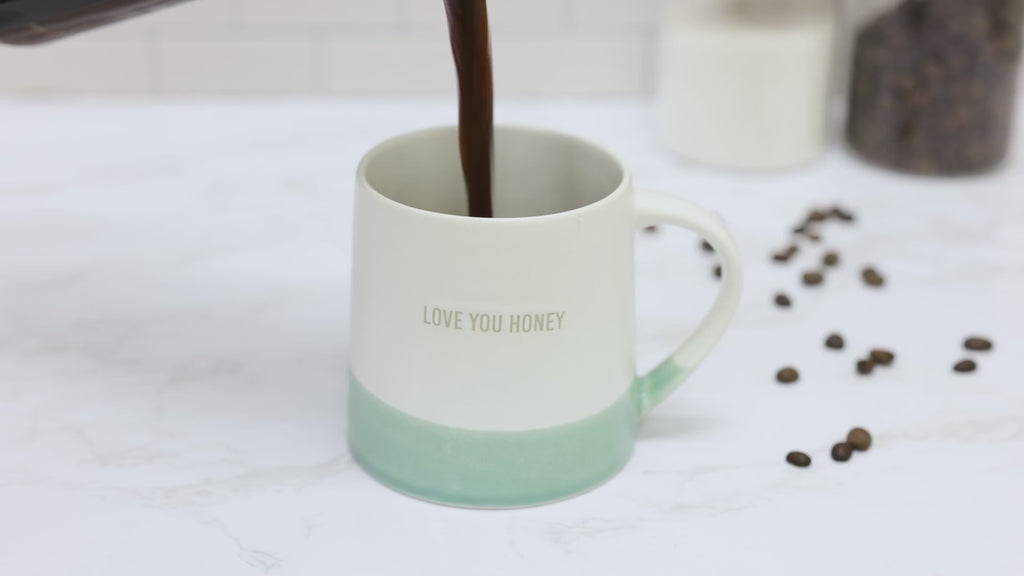 - IN-HOUSE DESIGN: The hand-dipped 1/3 green-colored bottom is unique to each piece. The tan debossed "Love You Honey" sentiment is stamped in the middle center of the white upper half of the front side of the cup. This simplistic, modern-styled mug is the perfect addition to any drinkware collection.