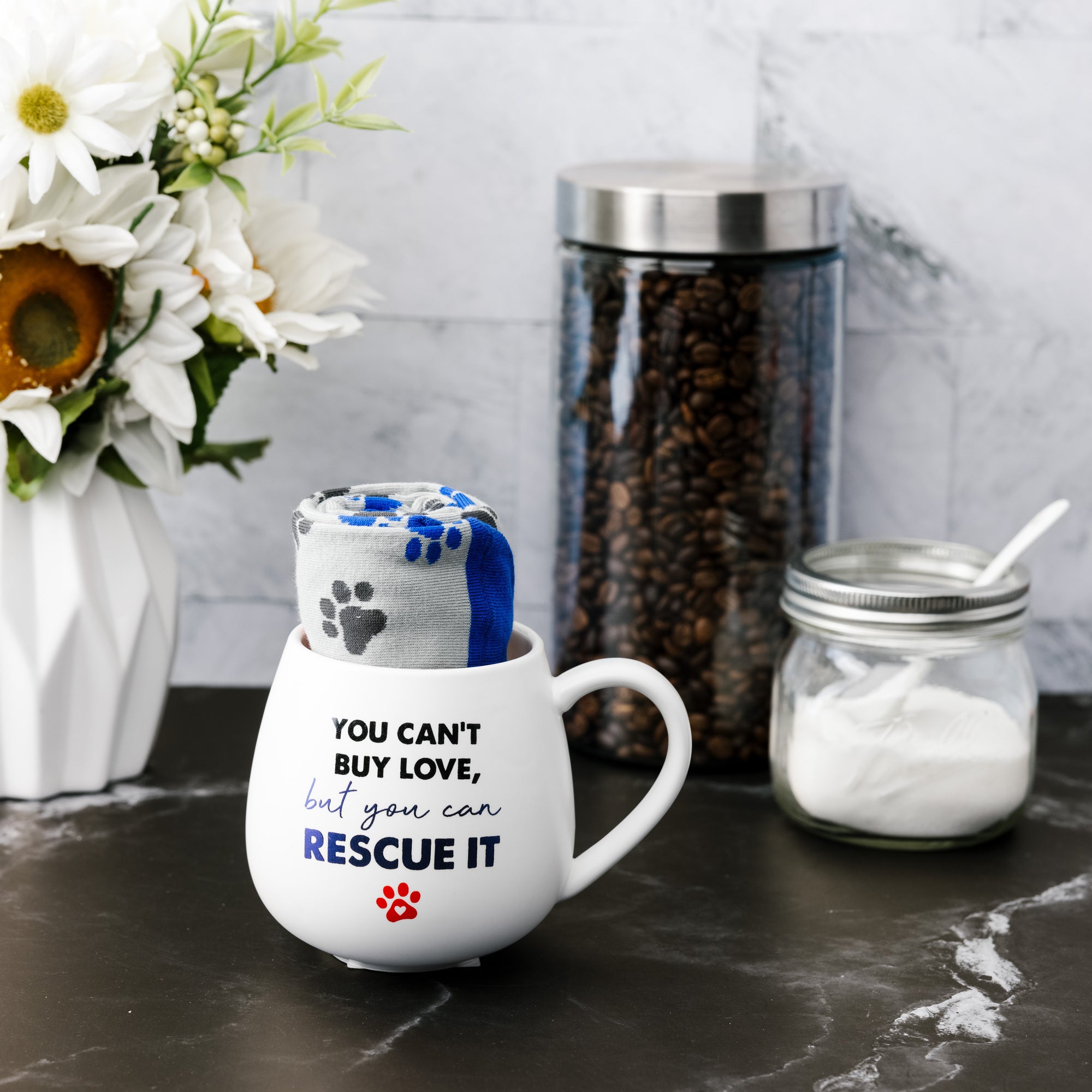 - IN-HOUSE DESIGN: Socks feature blue, red and black paw print pattern on a gray background. The heals, toes, and ankles are solid blue. The mug has blue and black "You Can't Buy Love, But You Can Rescue It" text and a red paw print with a heart center decal is printed onto one side of the mug.