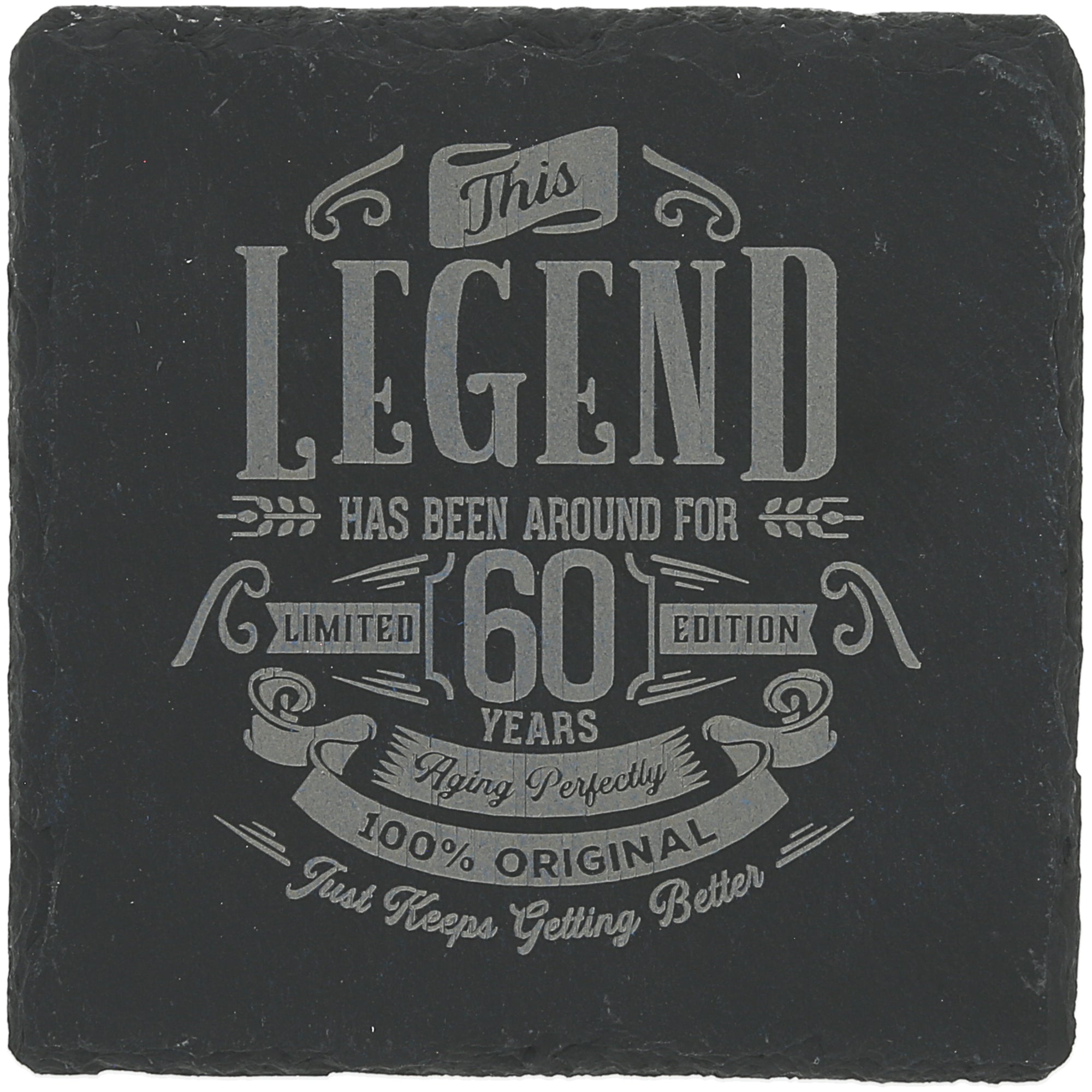 • PREMIUM QUALITY: This 4" x 4" slate coaster features engraved detailing and foam feet for stability. Its durable slate design makes it both functional and stylish, with the sentiment "This Legend Has Been Around For 60 Years Limited Edition Aging Perfectly 100% Original Just Keeps Getting Better" deeply engraved for a lasting impression.