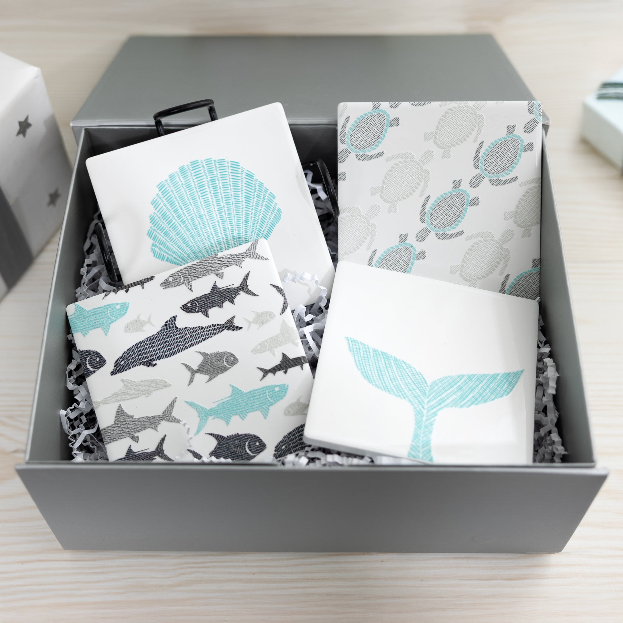 - IN-HOUSE DESIGN: This beach-inspired coaster set showcases unique marine-themed illustrations, including a delicate seashell, playful fish, a whale tail, and other aquatic elements. The artwork combines modern style with coastal charm, creating a look that’s fresh, airy, and perfect for any beach lover’s home. With soft ocean colors and intricate detailing, these coasters bring the tranquil beauty of the seaside to your living space.