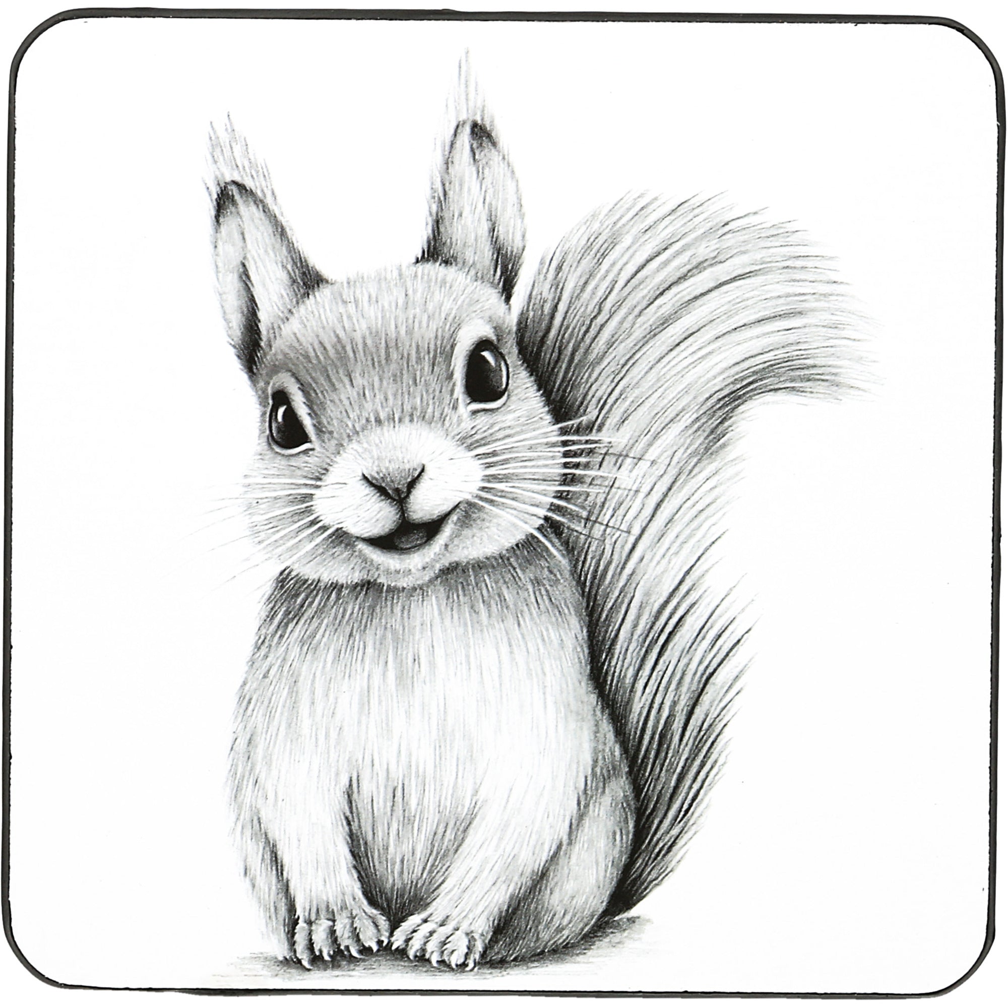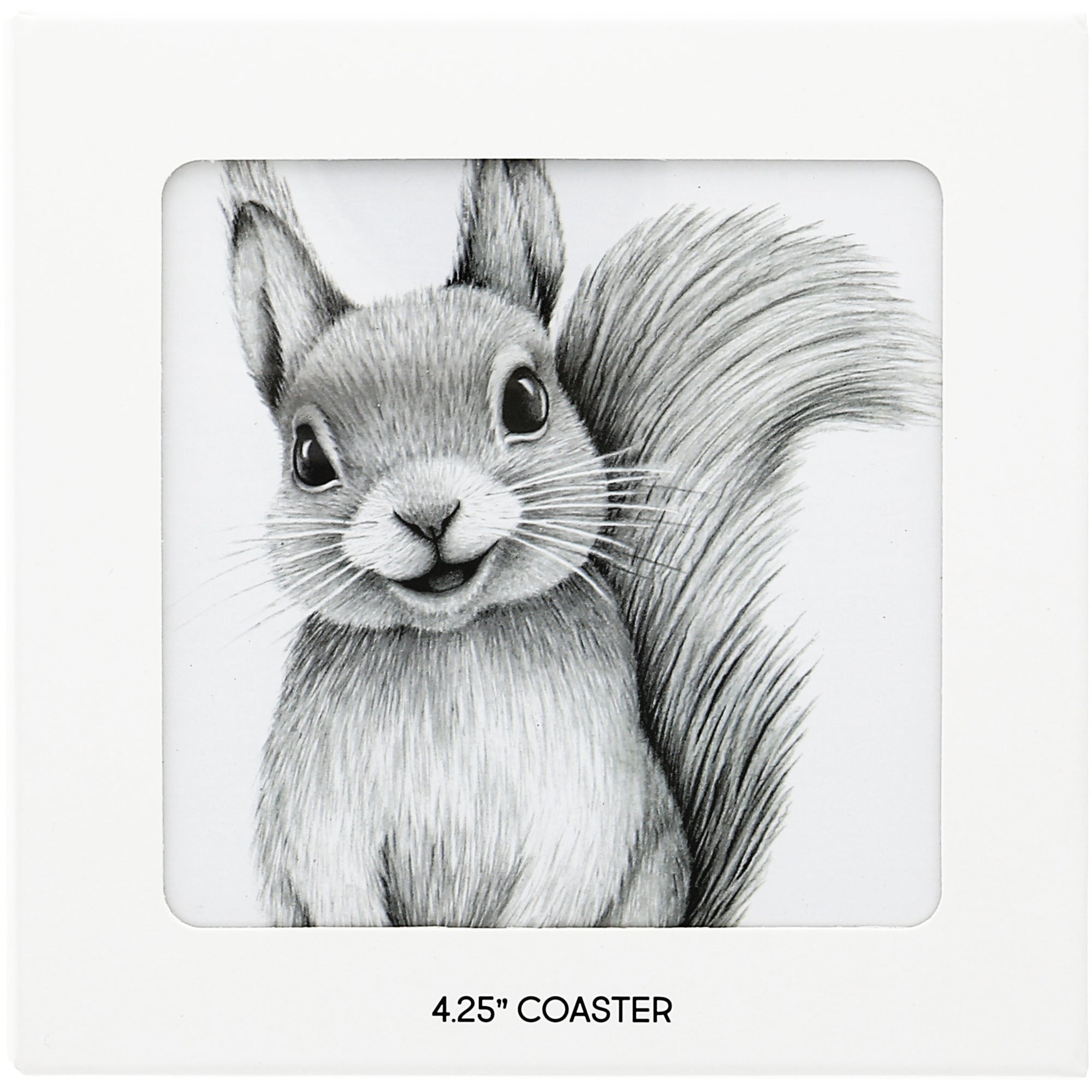 • IN-HOUSE DESIGN: The coaster features Katherine Sheard’s signature pencil-style squirrel artwork—complete with perked ears, fuzzy tail, and a slightly curious expression. The crisp black and white illustration pops against the white ceramic-like surface for a timeless and playful woodland vibe.