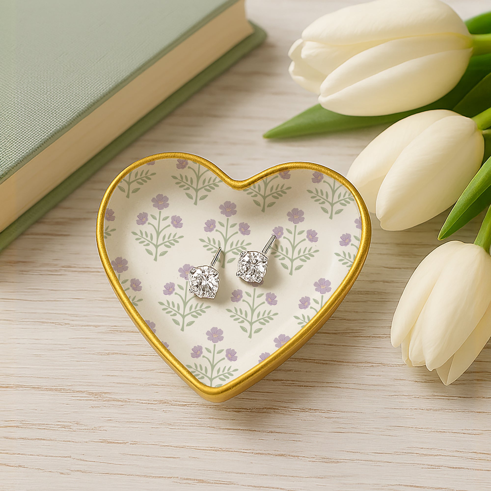 - PREMIUM QUALITY: This elegant 2-piece set includes a heart-shaped trinket dish and a pair of 5mm sterling silver cubic zirconia stud earrings. The dish is made from durable stoneware with a matte white glaze, hand-painted purple floral decals, and a gold-colored rim for added sophistication. The earrings feature hypoallergenic posts and sparkling stones that catch the light beautifully, creating a timeless, heartfelt keepsake.