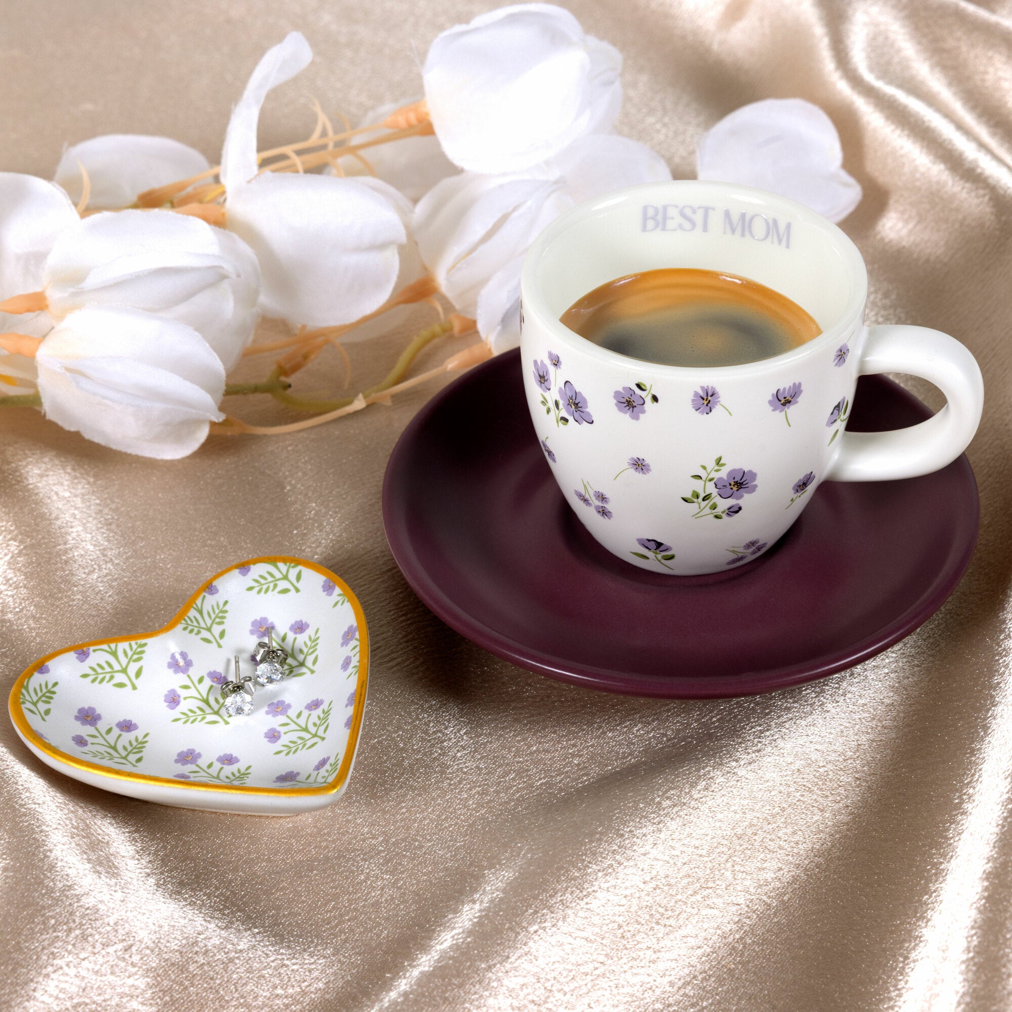 - IN-HOUSE DESIGN: The raised floral decal artwork and delicate purple tones evoke love and appreciation, while the gold-edged heart dish complements the shimmering CZ earrings. The phrase “Beautiful Mom” appears on the coordinating box, enhancing the sentiment and making it ideal for gifting. The combination of ceramic artistry and fine jewelry craftsmanship creates a truly special presentation.