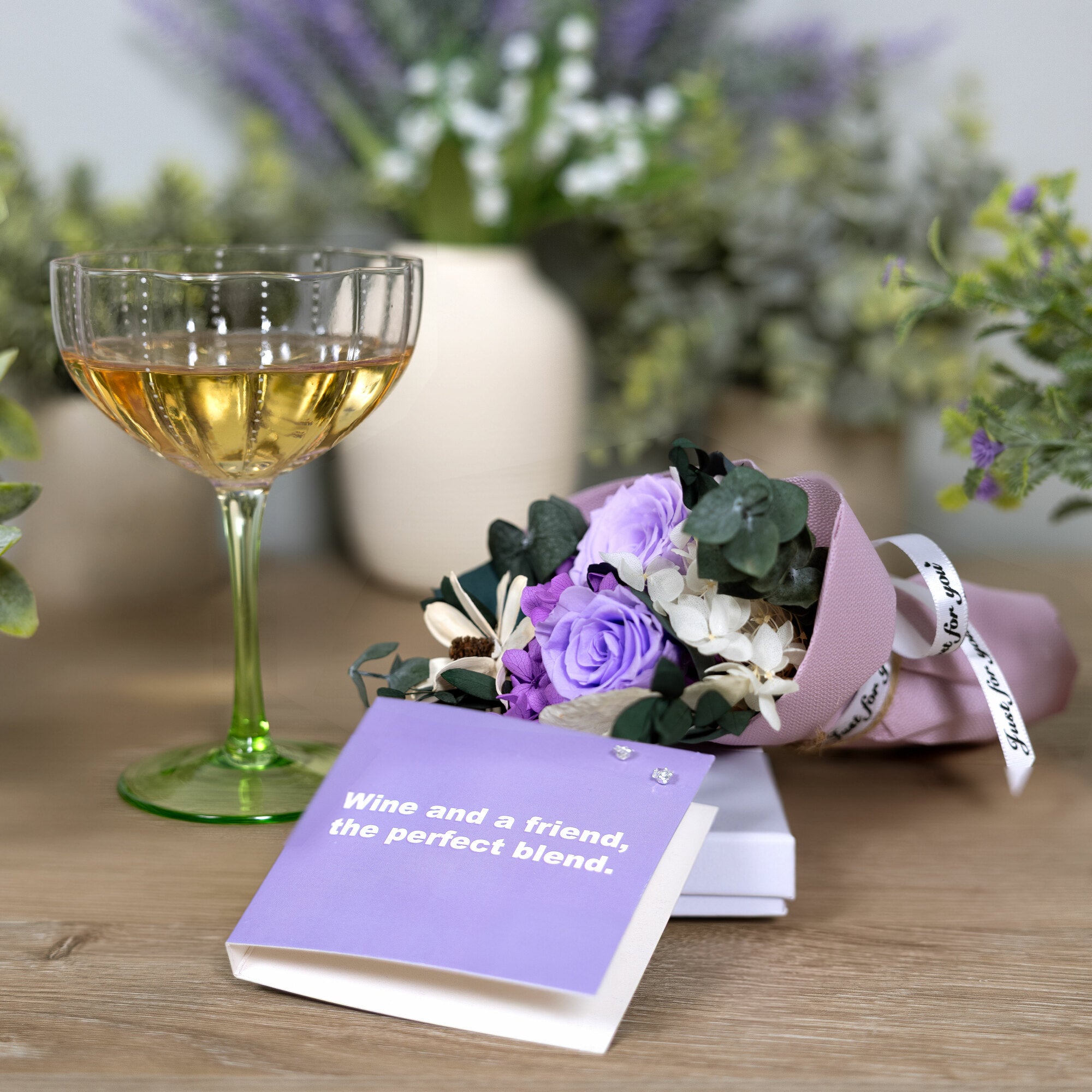 - IN-HOUSE DESIGN: Mounted on a folded purple card, the message says: “Wine and a friend, the perfect blend.” Embossed text adds an upscale feel, making it a classy and fun nod to strong friendships and wine nights.