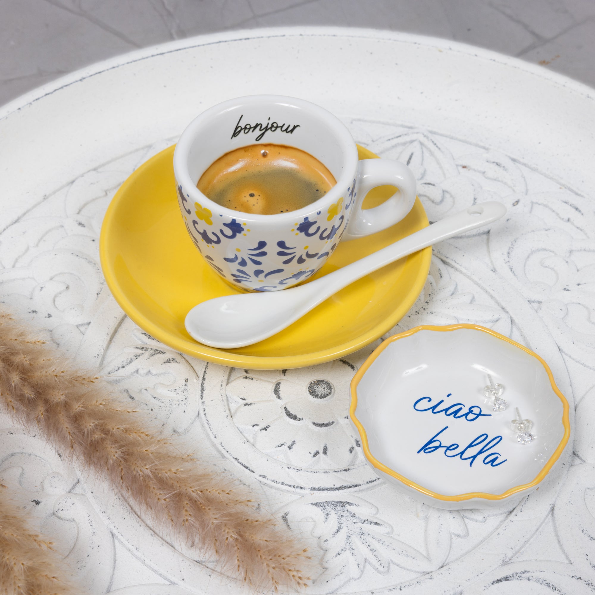 - PREMIUM QUALITY: Crafted from durable stoneware, this 2.75" trinket dish features a glossy white glaze and a hand-painted cobalt and yellow rim inspired by Mediterranean tilework. The raised decal artwork showcases the phrase “ciao bella” in elegant blue script, adding warmth and charm to any vanity or dresser. The coordinating 5mm sterling silver cubic zirconia stud earrings bring a subtle sparkle, completing the look with a timeless touch of sophistication. Packaged in a custom box with printed pattern accents and foam earring inserts for secure display.