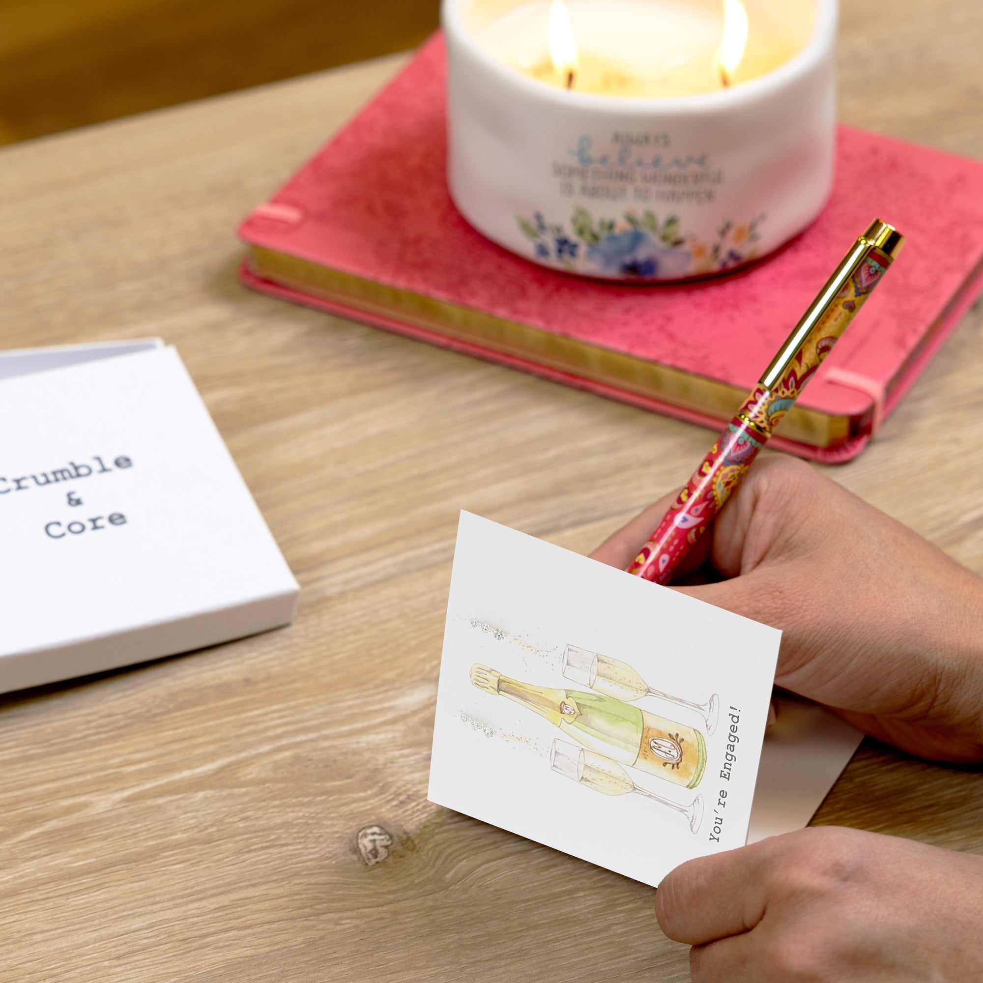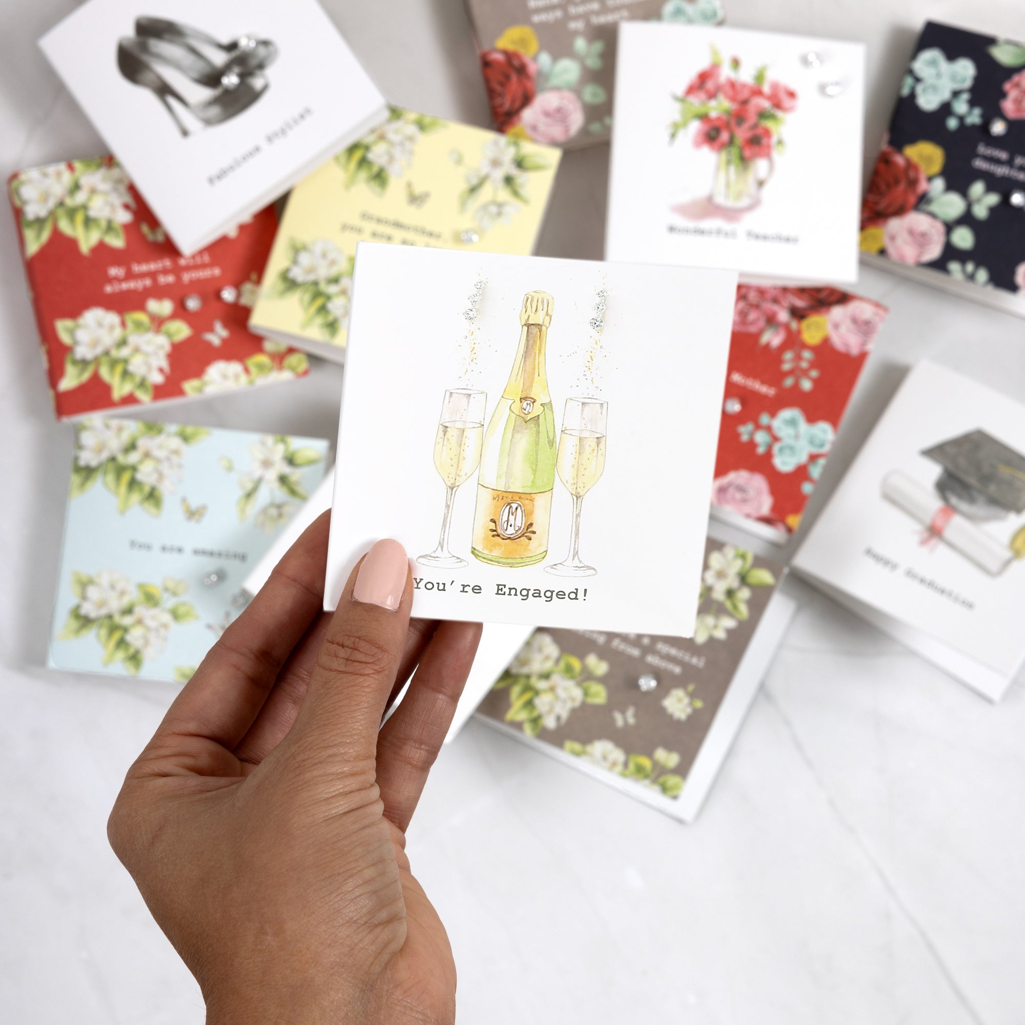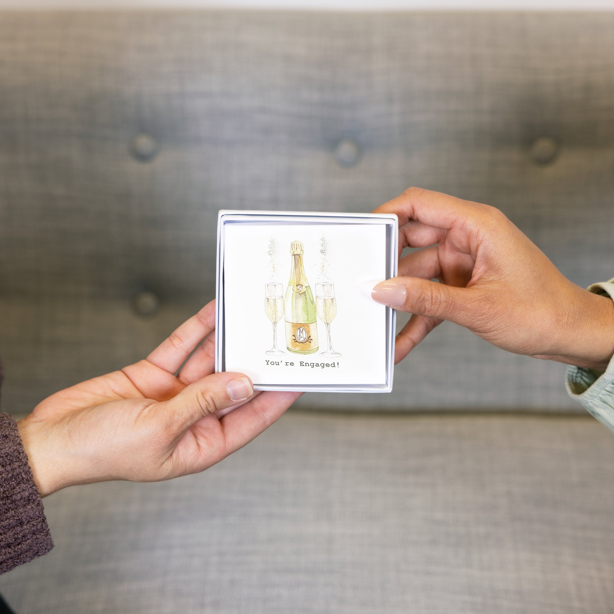 - IN-HOUSE DESIGN: The cheerful, watercolored, clear, and classy champagne-filled flutes cheer and dance around with bubbles accompanied by a bottle of champagne. The typewritten style gray "You're Engaged!" sentiment is placed below the celebratory printed design, whereas the earring is placed in the top center of the card.