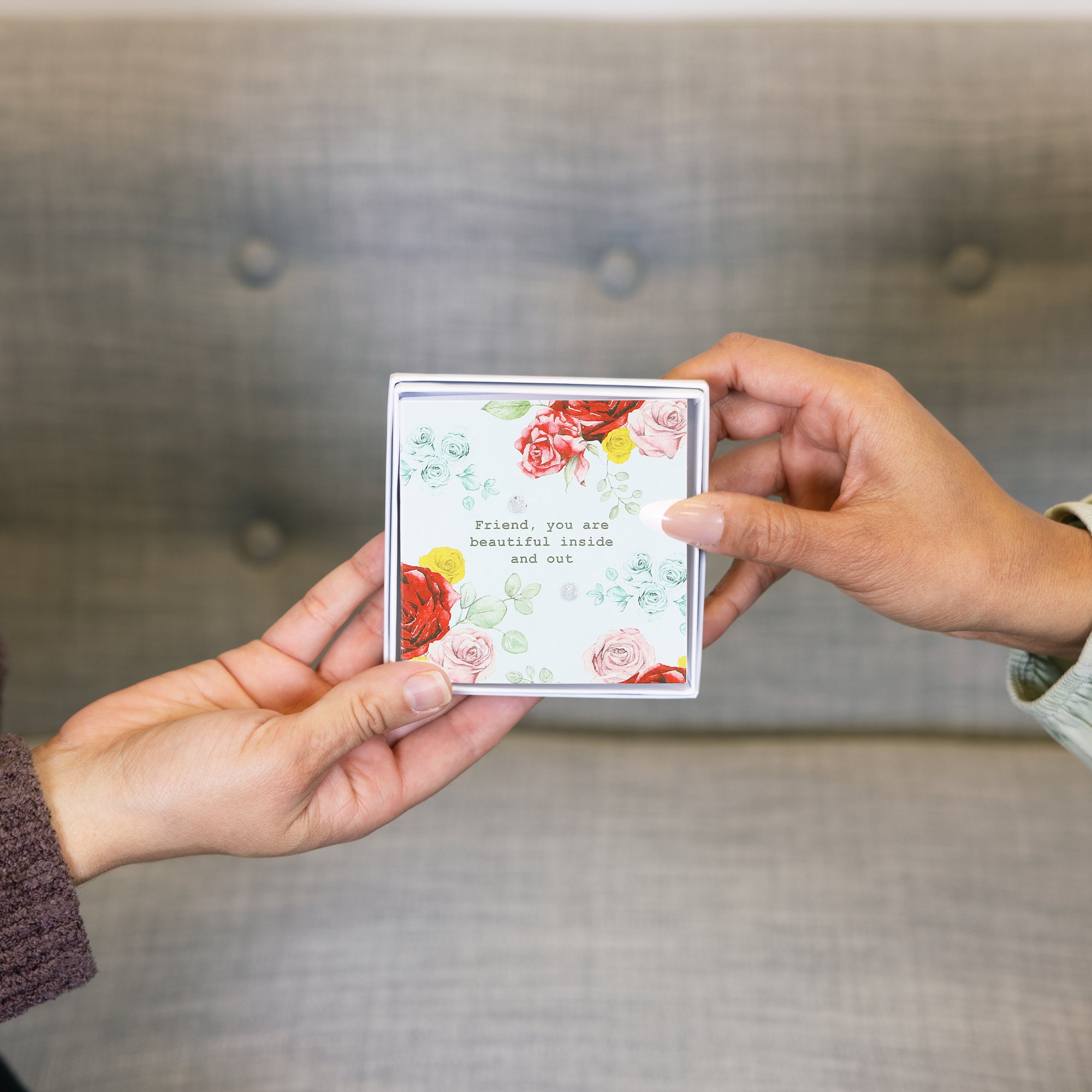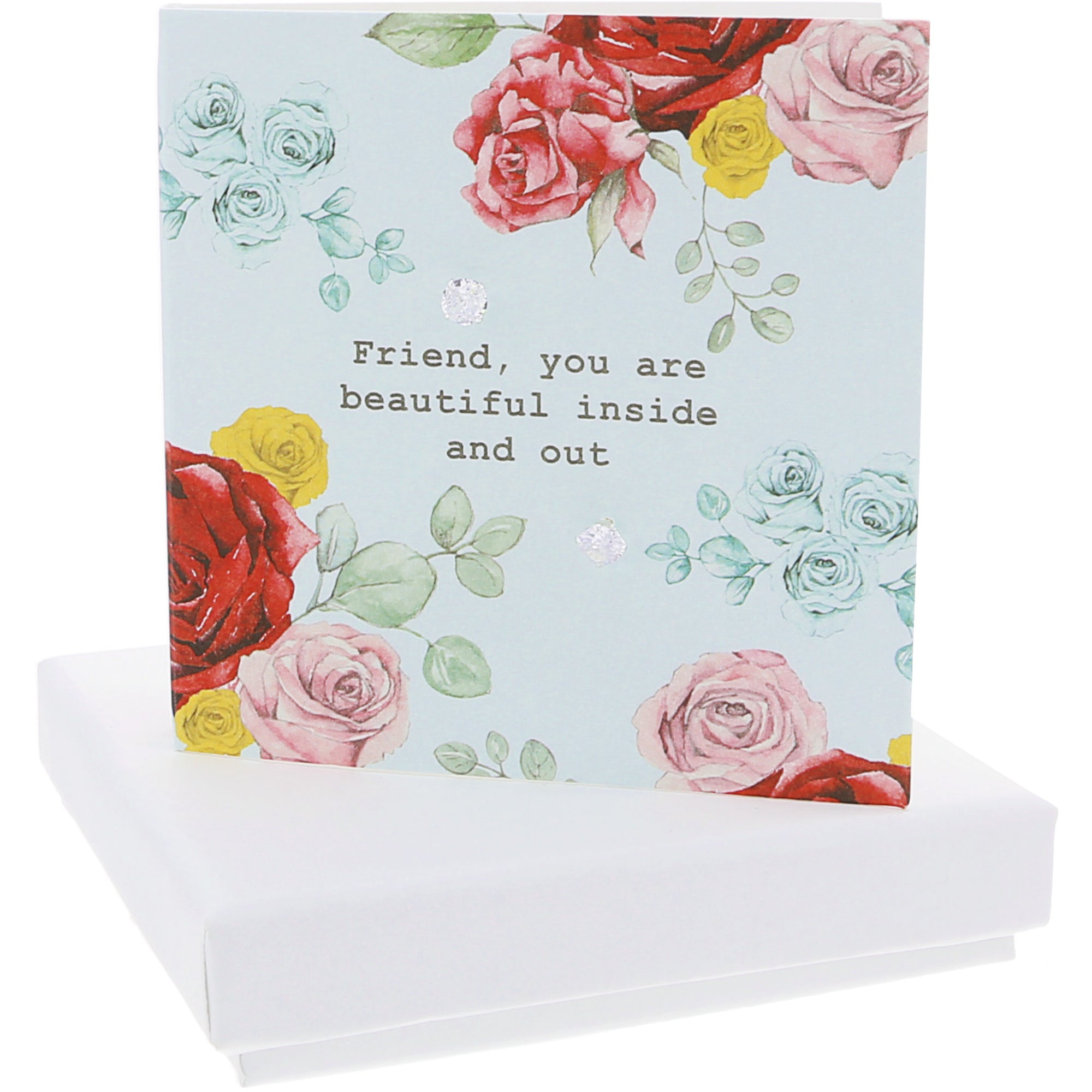 - IN-HOUSE DESIGN: The printed card has a seafoam green/blue background and a beautiful red, blue, pink, and yellow rose design. The earrings are strategically placed within the florals. The typewritten white "Friend, You Are Beautiful Inside And Out" sentiment is placed in the center of the greeting card.