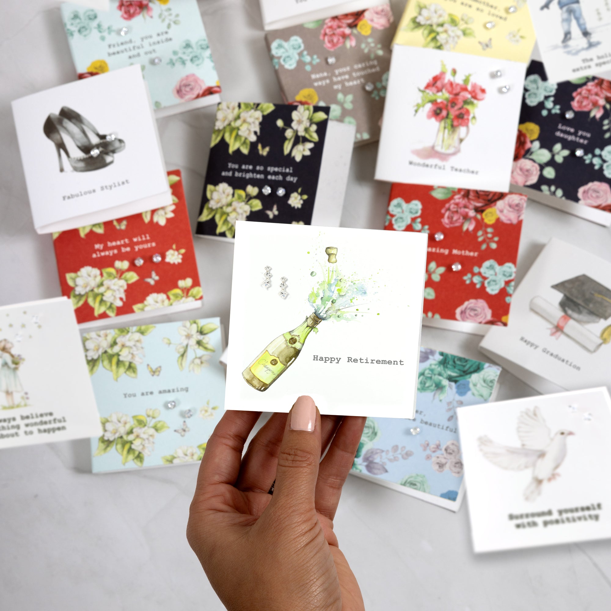 - IN-HOUSE DESIGN: The cheerful, watercolored champagne bottle has the cork popping off. The typewritten style gray "Happy Retirement" sentiment is placed below the celebratory printed design, whereas the earring is placed in the top center of the card.