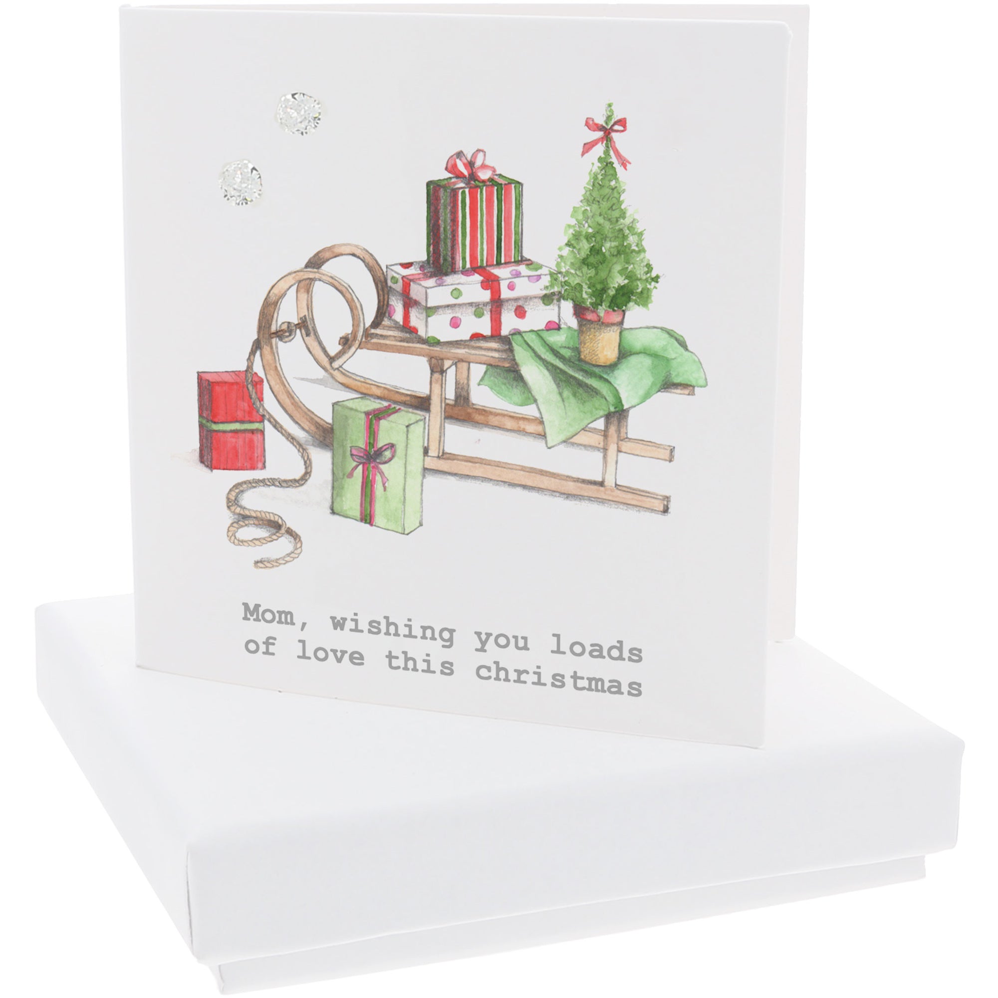 • IN-HOUSE DESIGN: The wooden sleigh with presents and a mini pine tree in a winter wonderland setting have the typewritten style gray "Mom, Wishing You Loads Of Love This Christmas" sentiment below, whereas the earring is placed in the upper left of the card.