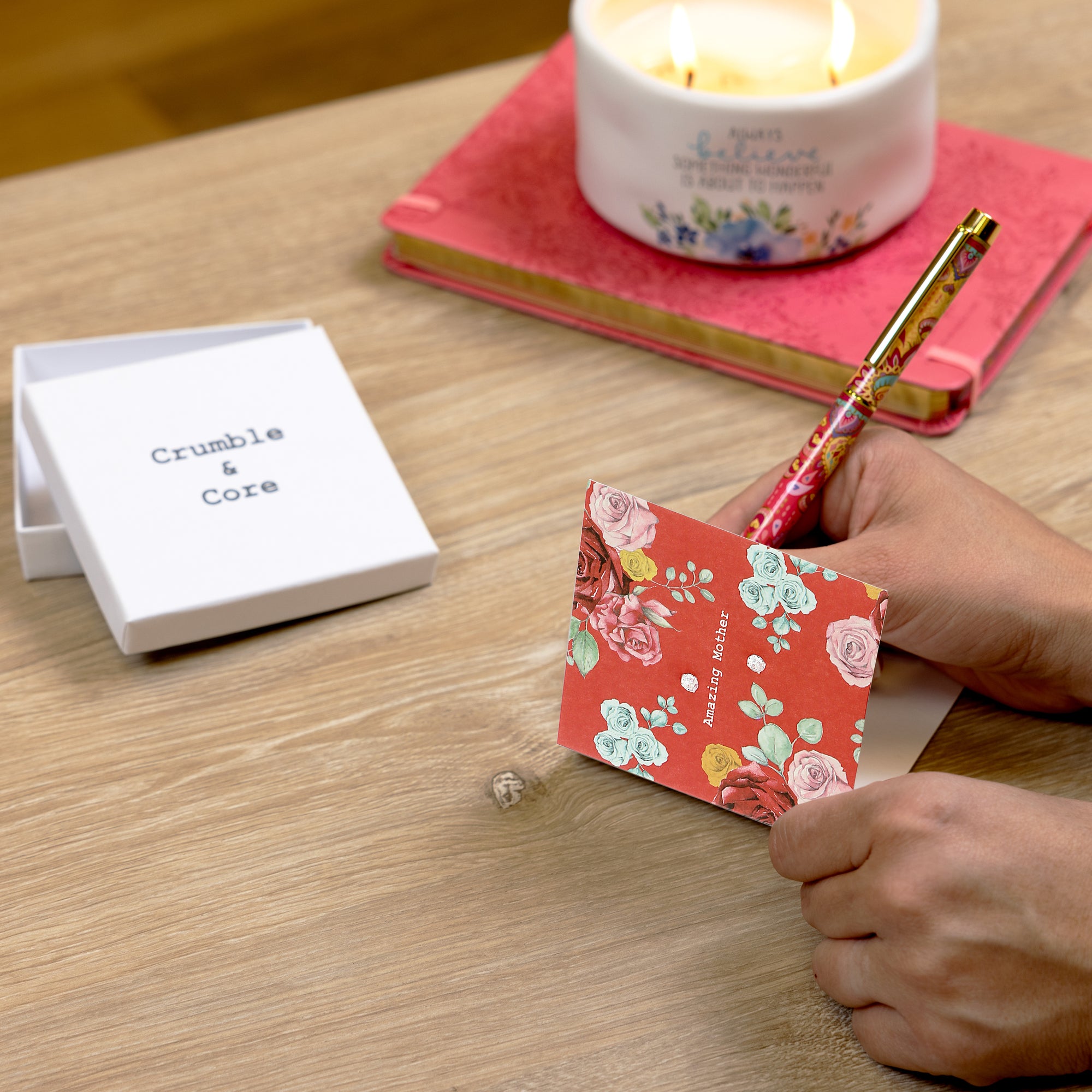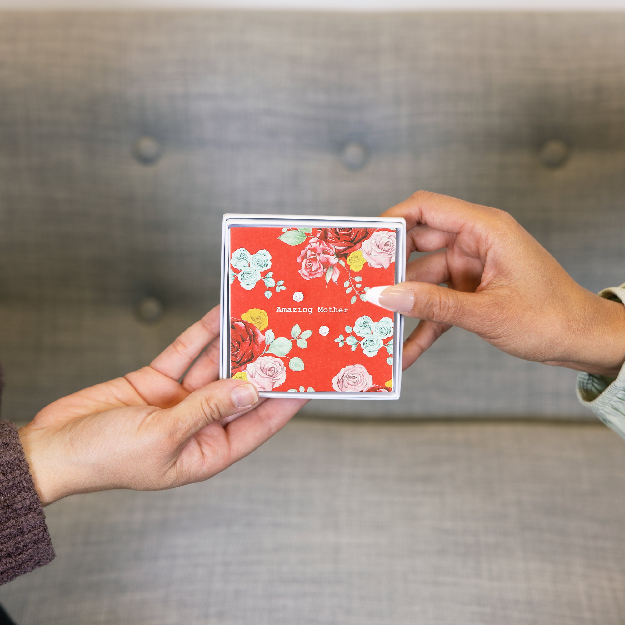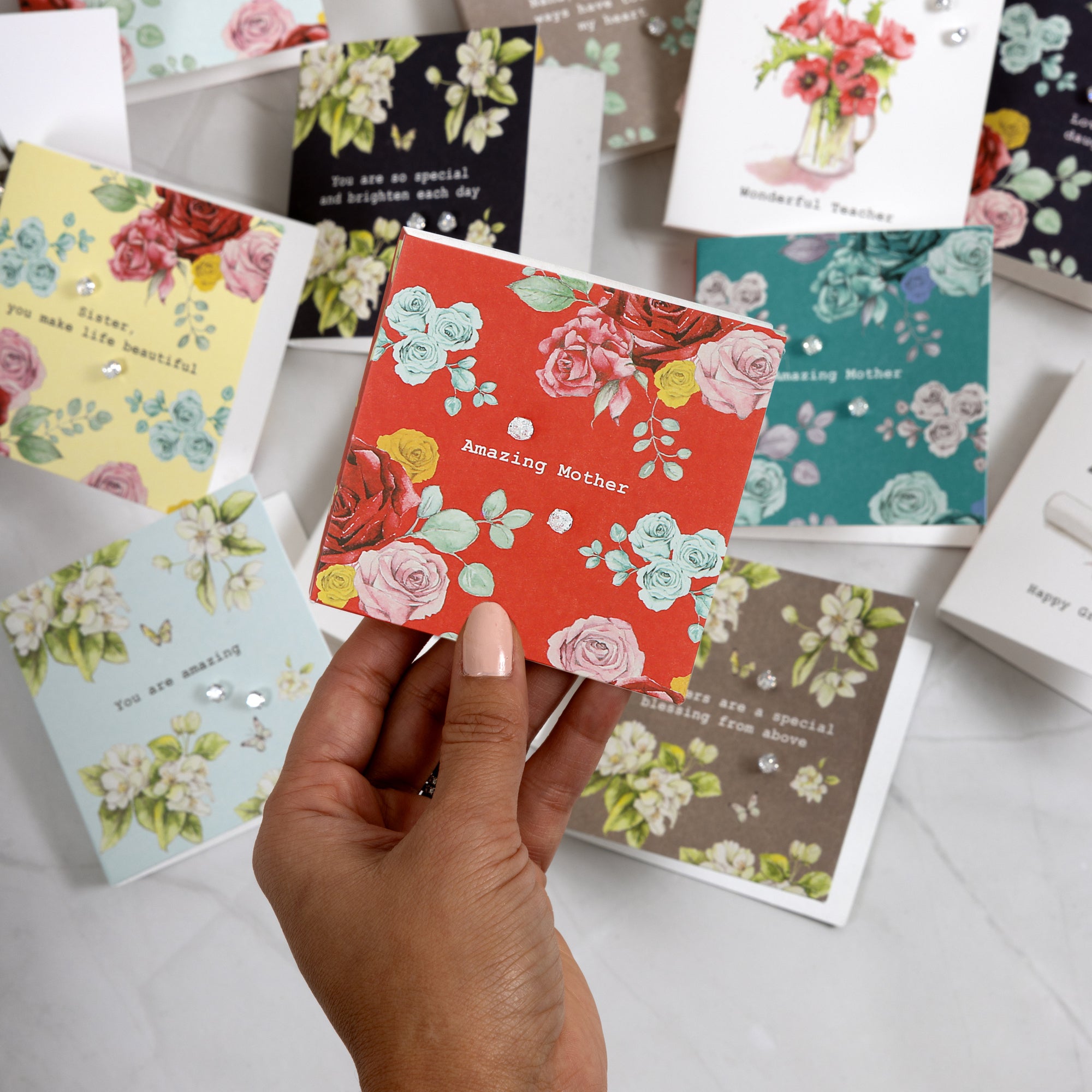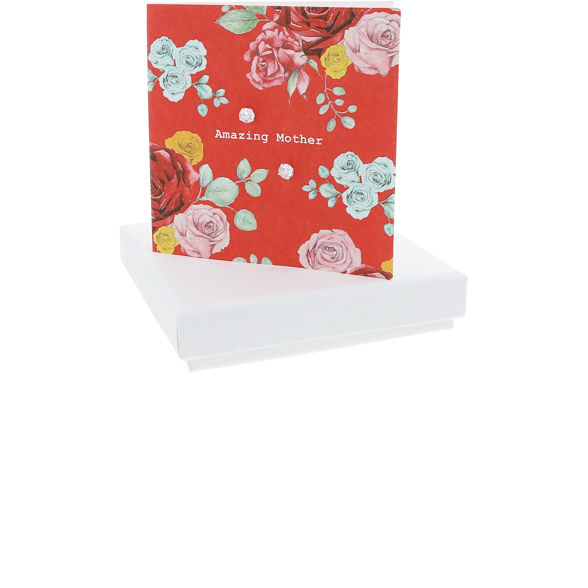 - IN-HOUSE DESIGN: The printed card has a red background with a beautiful blue, yellow, pink, and red rose flower design. The earrings are strategically placed within the florals. The typewritten white "Amazing Mom" sentiment is placed in the center of the greeting card.