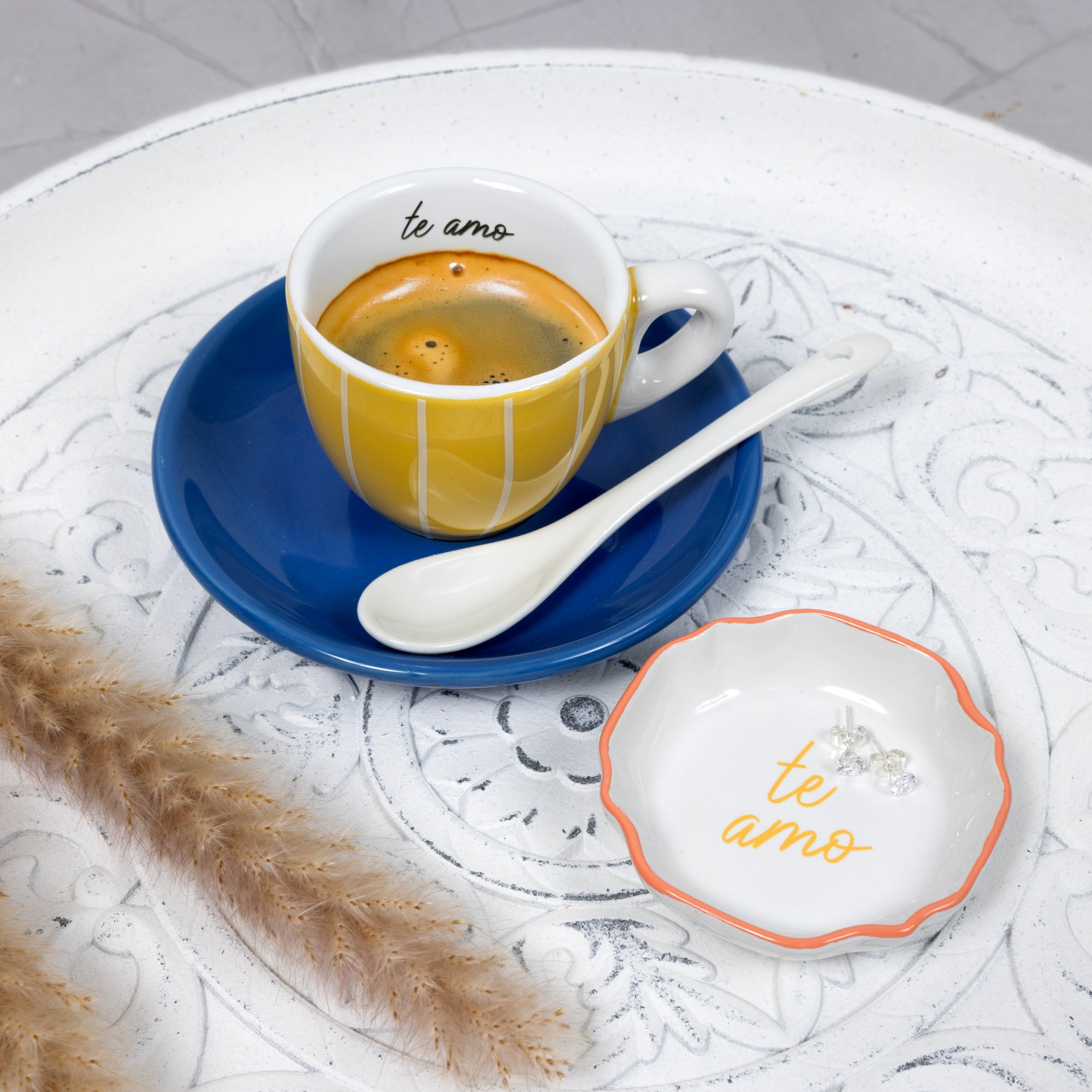 - IN-HOUSE DESIGN: Part of the Mediterranean Dreaming line, the “te amo” dish embodies warmth and heartfelt connection through its soft coral palette and elegant typography. The raised lettering and delicate floral-inspired base design pay homage to Mediterranean craftsmanship, while the CZ earrings add timeless charm—creating a set that radiates love and sentiment.