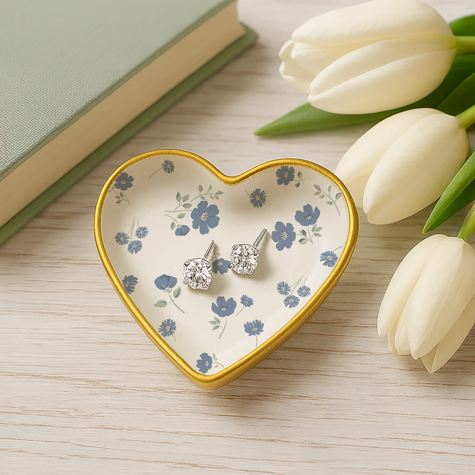 - PREMIUM QUALITY: This 2-piece set includes a glossy white stoneware heart-shaped dish featuring raised blue floral decals, a matte finish, and a hand-painted gold rim. Paired with sterling silver 5mm cubic zirconia earrings, the set offers timeless style and heartfelt meaning. Each piece is crafted for durability and long-lasting beauty.