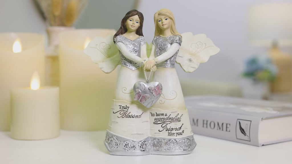 - IN-HOUSE DESIGN: This darling pair of angels makes for the sweetest sentimental piece. "Truly Blessed To Have A Wonderful Friend Like You" text is debossed and painted onto the front of the angel, alongside an intricate silver design and heart. One brown haired angel and one blonde haired angel are jointly holding a heart decorated with pretty pink butterflies. There are foam pads on the bottom to prevent surfaces from being scratched.