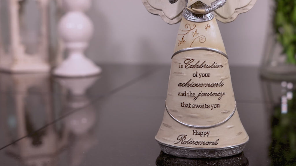 • IN-HOUSE DESIGN: "In Celebration Of Your Achievements And The Journey That Awaits You; Happy Retirement" text is debossed and painted onto the front of the angel, alongside an intricate silver design and star.