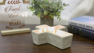 - IN-HOUSE DESIGN: The new & innovative candle offers a unique message for your loved one within the wax as time progresses. You will see a cursive written "Trust In The Lord With All Your Heart Proverbs 3:5" sentiment after about 10 minutes. As you watch, the entire decal with a black scroll design will appear after 60 minutes. Then, the message will hide again and reappear with each burn. The left side bottom of the candles has a simplistic "Proverbs 3:5" tan decal. The 12-sided glossy finish vessel is shaped into a cross. The interior bottom has a tan "Trust In The Lord With All Of Your Heart" permanent design.