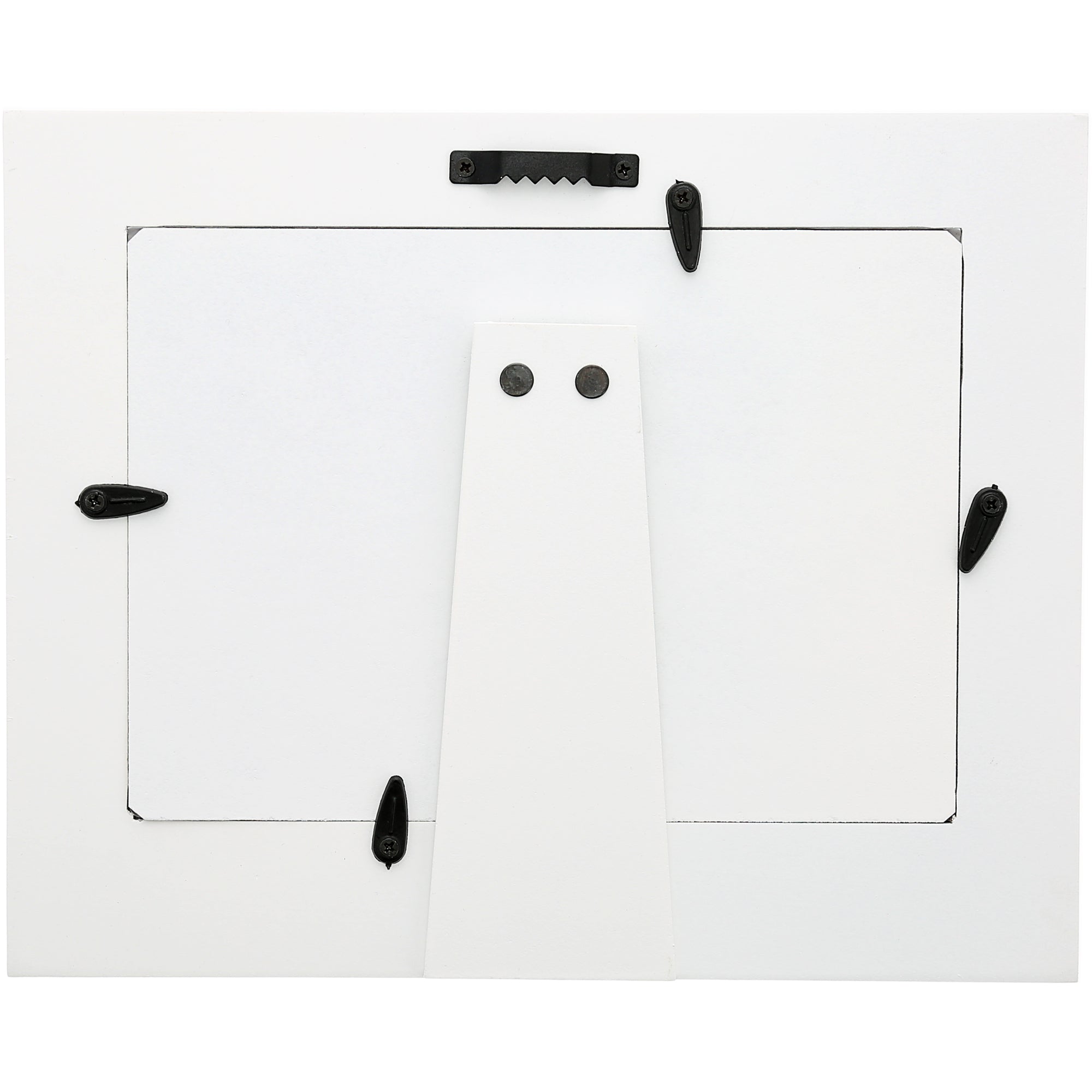 • PREMIUM QUALITY: 9" long x 7.25" tall horizontal easel back rustic whitewashed picture frame holds a horizontal 7" x 5" photograph. The backside is white in color and features four sturdy thick black plastic turn knobs for image replacement. Materials include MDF, glass, and plastic.