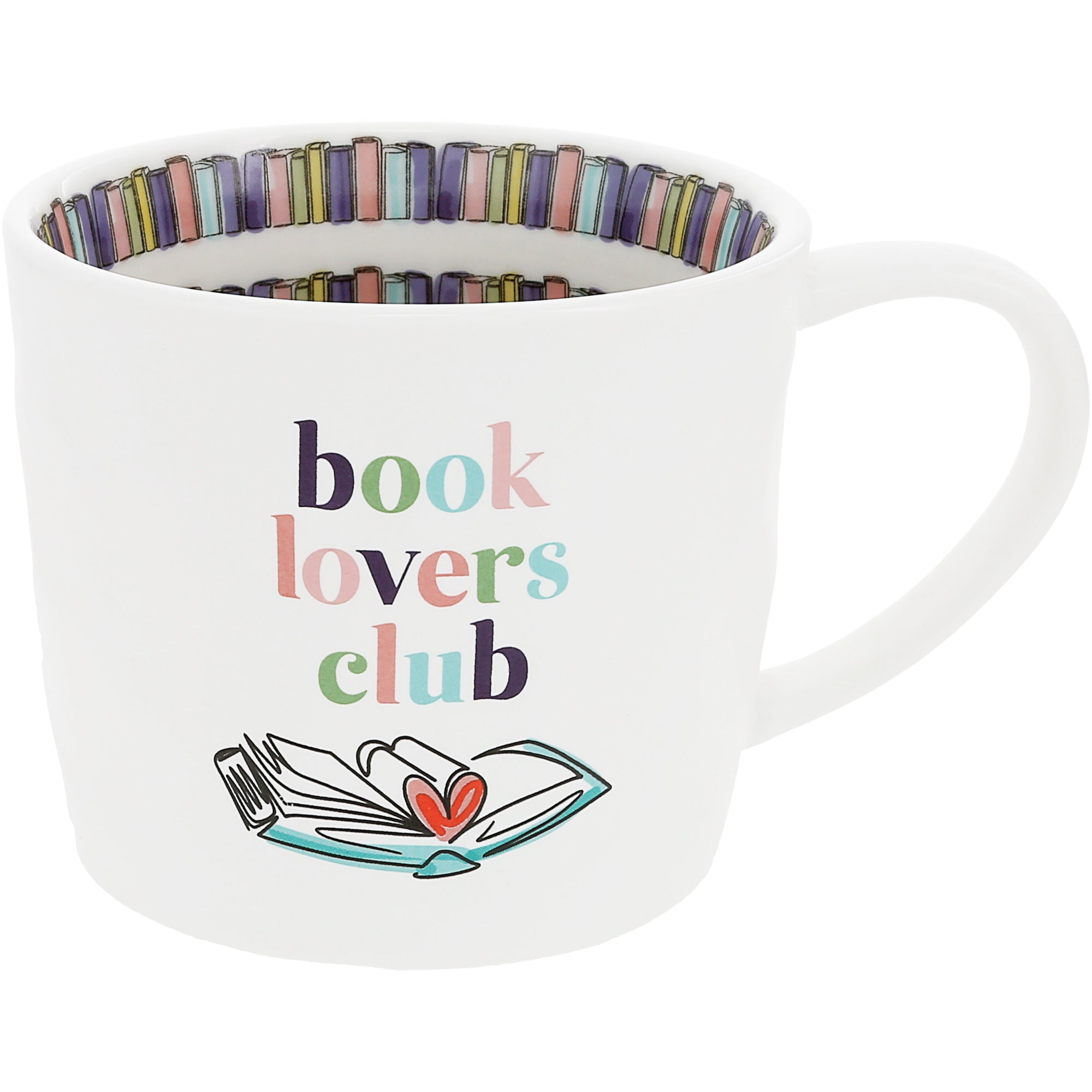 - IN-HOUSE DESIGN: The front features a sweetly illustrated open book with a red heart nestled between its pages, paired with pastel block lettering that reads “book lovers club.” The text is layered with a raised decal effect for added dimension. Inside the rim, a colorful border of vertically stacked books circles the interior, creating a secret bookshelf surprise with every sip.
