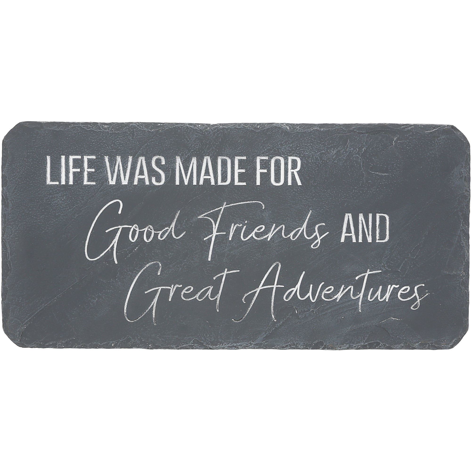 - IN-HOUSE DESIGN: Finished in a charcoal slate tone with subtle surface texture, the stone features the heartwarming phrase “Life Was Made for Good Friends and Great Adventures” in hand-painted white lettering. The design pairs block print with flowing script to capture the spirit of joyful connection and open-road exploration. Hand-painted details add depth and visual warmth, creating a finished look that feels personal and refined.